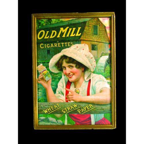 Old Mill Cigarette Paper Sign, Framed Under Glass, a small hole in the barn and a tear at 9:00 otherwise in excellent condition, 14 x 20 1/2 inches.
