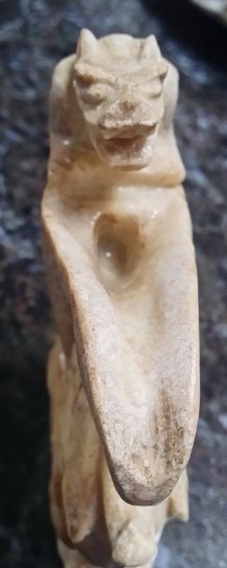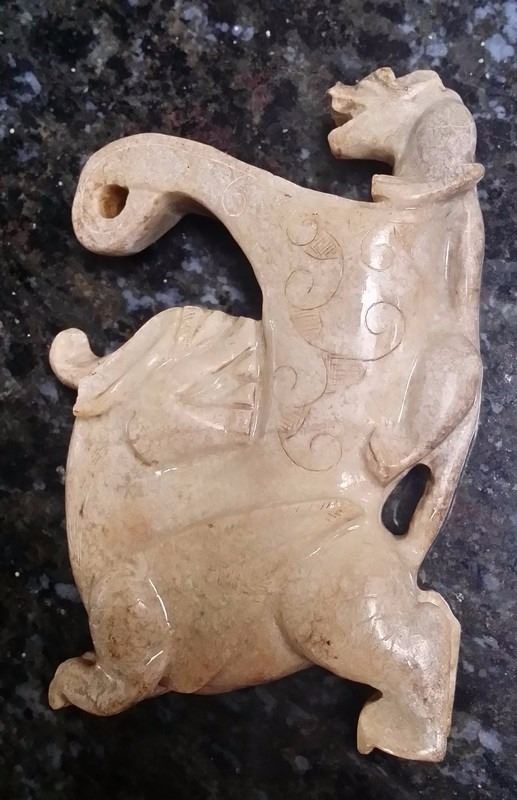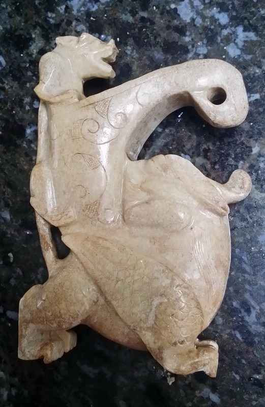 Multiple Artwork Technique Applied Including Open-work, Carved Etchings & High Relief Design. One Horned Guardian with Tails, Wings and Reptile Scales