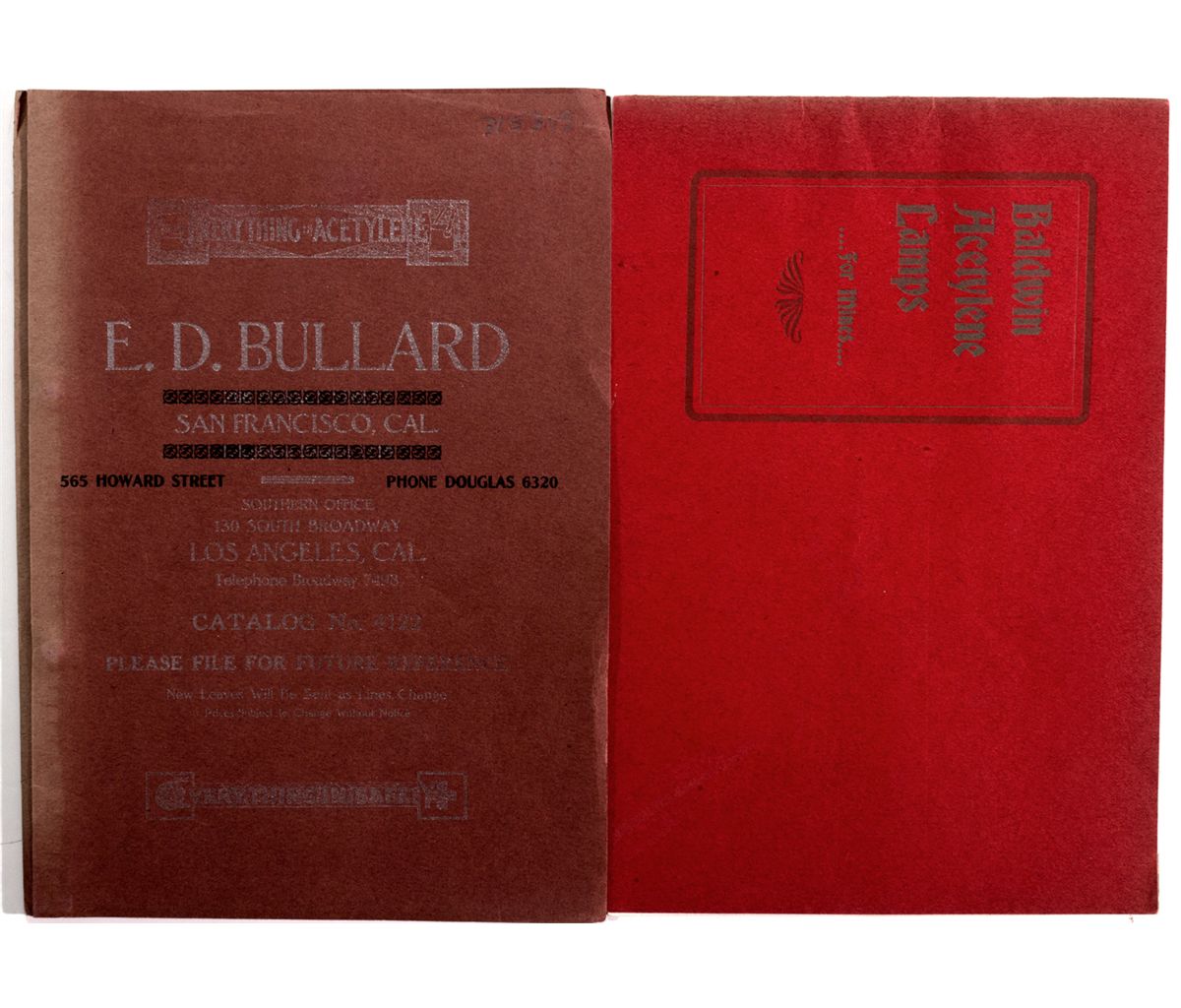 Lot of 2 catalogs: 1) from Baldwin Acetylene Lamps of New York. This 1902 publication is 15 pages in length and features in photos and descriptions, all the latest in mining lighting equipment, including sperm candles and a nice selection of carbide lamps. There are also several pages of testimonials from satisfied customers. The book is in very nice condition. Also included is E.D. Bullard Company, mining supply. Bullard was founded in 1898 and had offices in San Francisco and New York. This publication features photos and descriptions of a wide range of mining hard goods, from welding goggles, to welding equipment, stretchers and crucibles. The book is 22 pages and in very nice condition. - Ken & Rosemary Roberts Collection -59885