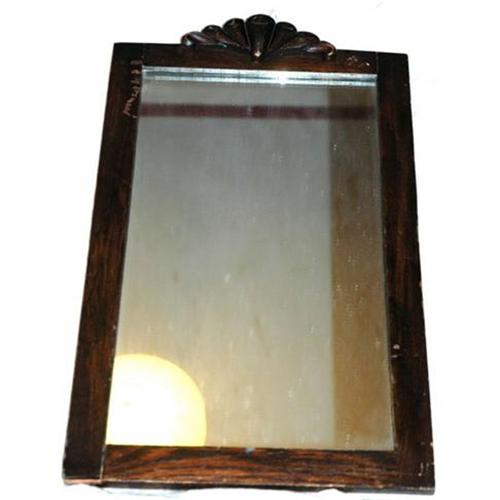Lovely old mirror with art deco detailing on the top of the wood frame. It measures 14 1/4" x 24 1/2". <p> The condition is good. There are some shallow scratches in the finish on an area on the left side of the frame near the top. The condition of the mirror is good but it looks like it could use more cleaning. I merely whipped off the dust to get the pictures.