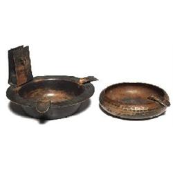 Old Mission Kopperkraft ashtray, applied holders, 6”w x 3.5”h; with a Roycroft ashtray, both in hammered copper, both original patina, both marked, 5”w