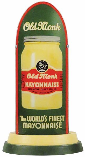 Old Monk Mayonnaise Counter Top Light Up Display. Chip on glass at 12:00 otherwise excellent working condition. 7 X 13 1/2 X 4 inches.