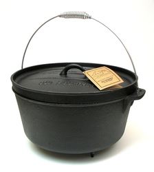 Old Mountain 12 Qt. Dutch Oven with Feet Flat & Flanged Lid. Measures handle to handle 17"W x 10.5 overall height x 15.75"D. Legs hold the pot 1.5" above fire and the pot is 6"D.