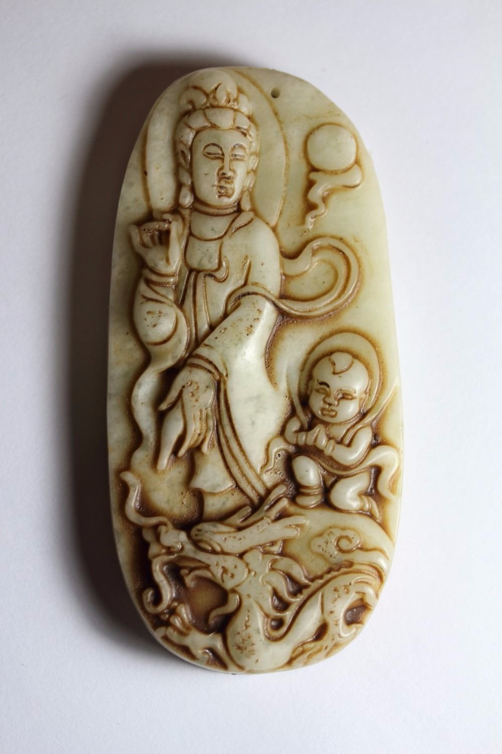 Old Natural Jade Hand Carved Buddha Guanyin Pendant.......size .....88 x 42 mm ...Origin - China