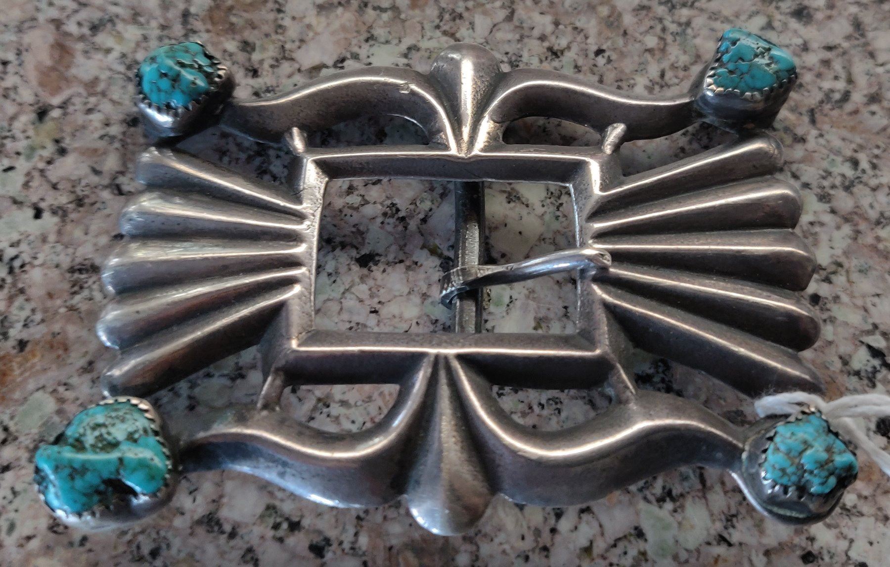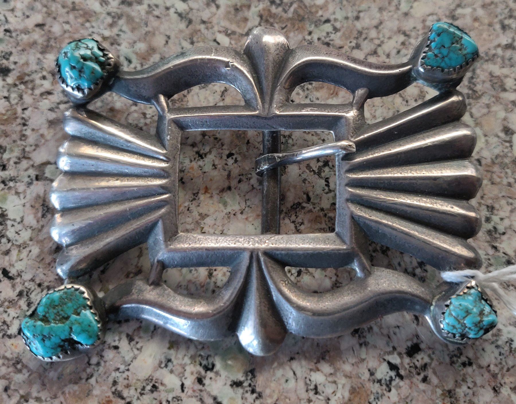 Old Navajo Buckle, c. 1930s. Made of sterling and turquoise, the item measures 2 1/2" x 2" x 1/3". Navajo. Sandcast silver buckle, nice turquoise, weighs approx. 42.5 grams. Condition: Patina, see images. Shipping: $18.50 w/insurance and signature, due to value.