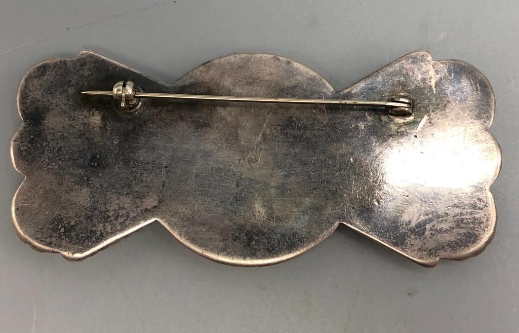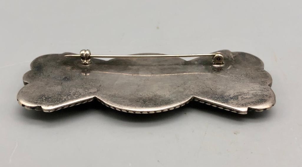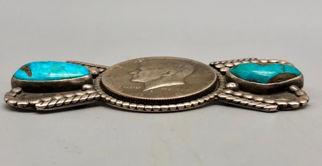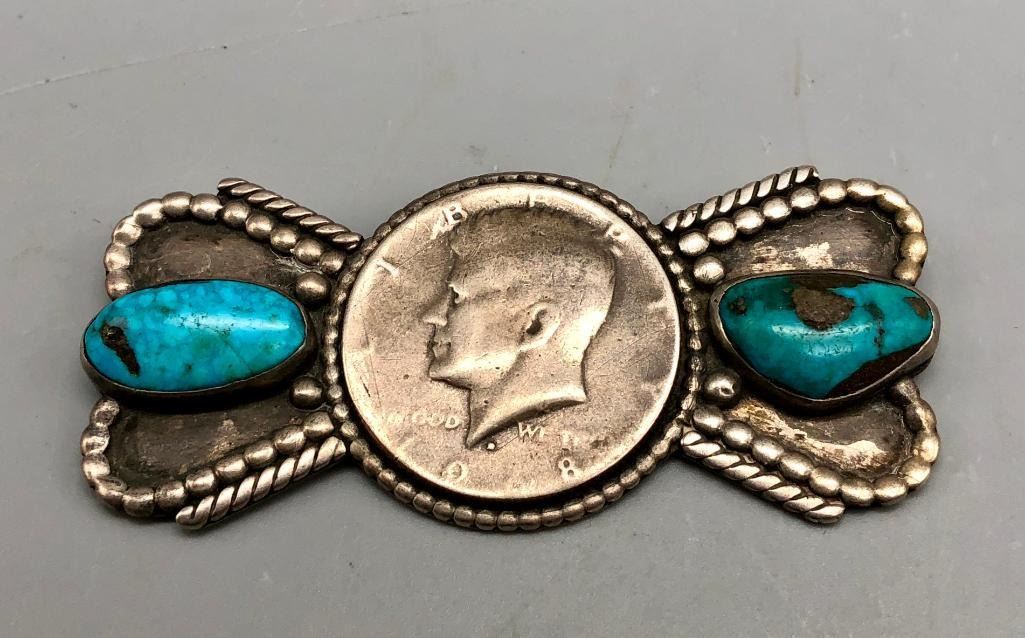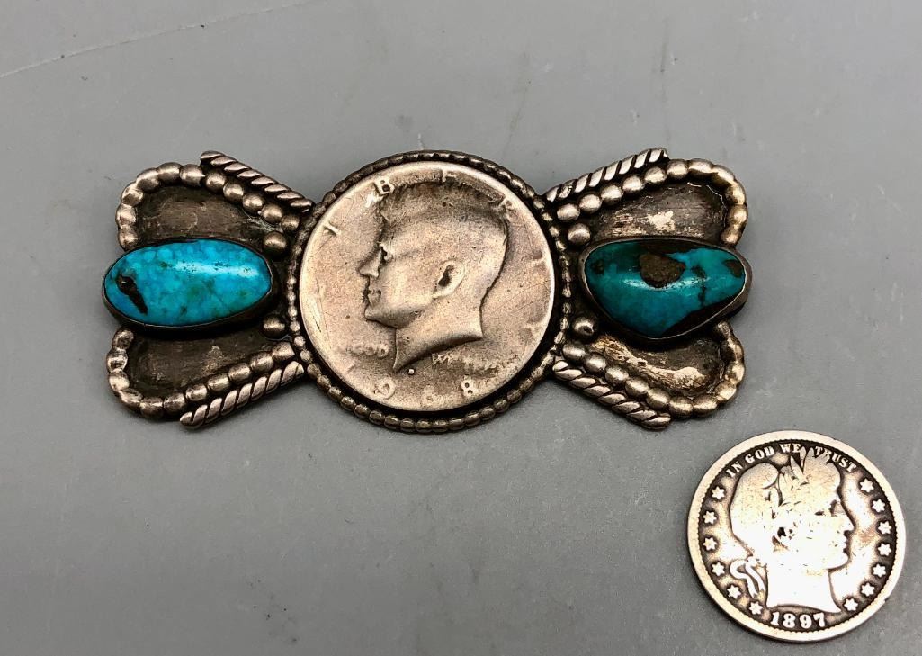 For sale in this lot is an old Navajo pin. Here is a beautiful old pin that is set with a fifty cent piece in the center and two nice older turquoise cabochons on either side. It also has great silverwork that includes silver dots and twisted "rope". It is in the shape of a traditional butterfly pin and is made from sterling silver. MAKER: Unmarked. APPROX AGE: Circa 1960s. SIZE: 3-1/8 inches wide X 1-3/8 inches tall. Weighs 38.2 grams. CONDITION: Good for its age, normal wear expected. Please look closely at the pictures as they are an important part of our description and are hereby incorporated into the description, specifically with regards to condition. SHIPPING: There will be a $5 handling / packaging fee for shipping this lot. The actual cost of postage will be added on top of that. BUY IT NOW: If you would like to buy this item now, without waiting for the auction day to bid on it, we do offer this option (which is available up to 48 hours before the actual auction starts). The “Buy it Now†price is the high estimate of this lot (plus applicable fees and the Buyer's premium is discounted to 10% when using the Buy it Now option). If you would like to exercise this option, you must contact us by email (or phone as long as you talk to someone live). Reference this lot number and your intention to "Buy it Now."