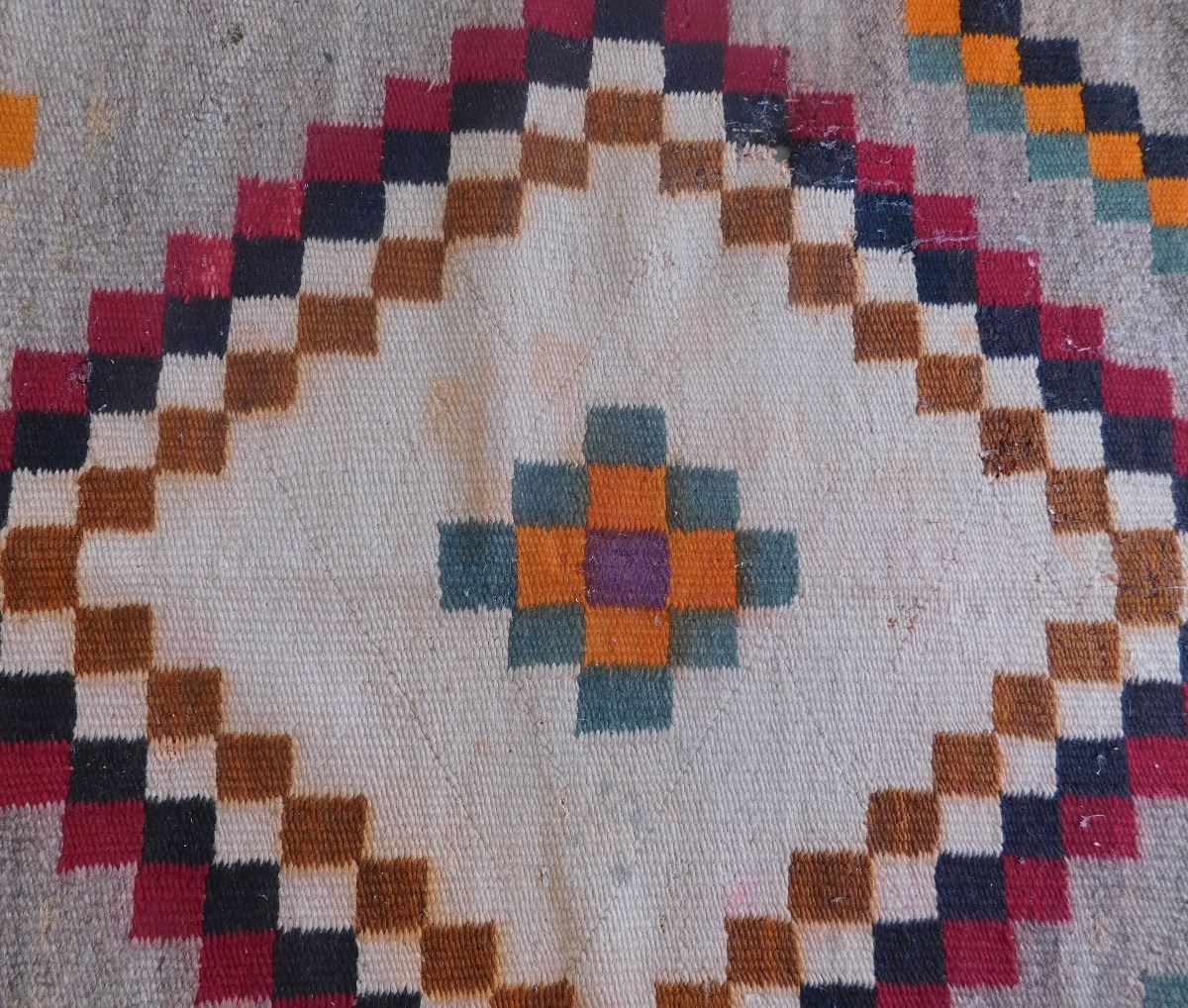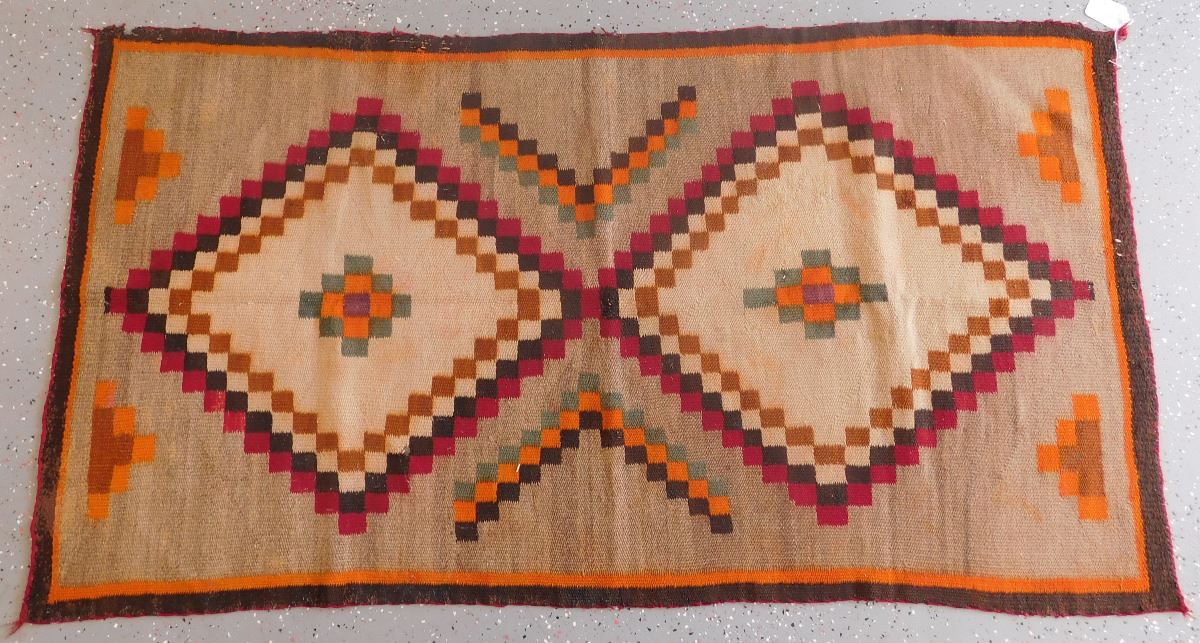 Old Navajo Weaving from about the 1930s, measuring 63 x 33 inches with great red, grey, orange and brown colors. This item is from an estate of a longtime collector in California. Condition: There is a small hole and some edge damage, see images. Shipping: $26.50