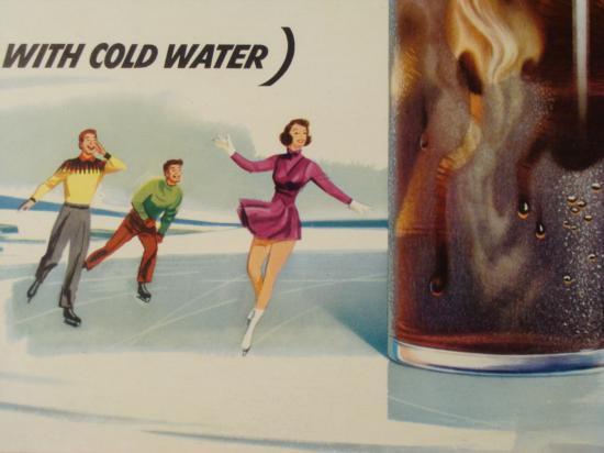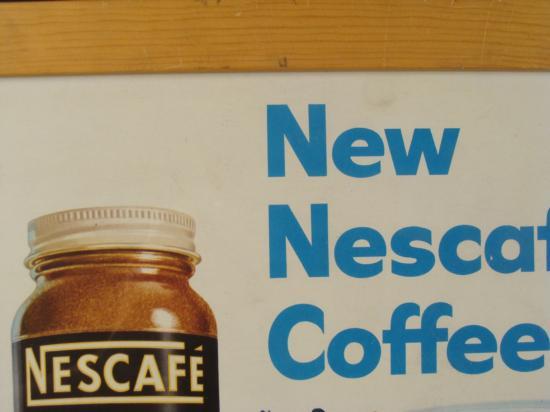 Nescafe Iced Coffee is being shown in this vintage ad on an ice skating rink, and in a super size! The skaters certainly look pleased, in this humorous illustration. The date of this sign is not known. Its condition is very good, with light wear on the blonde wood frame. The frame size is 12 1/2" x 30".
