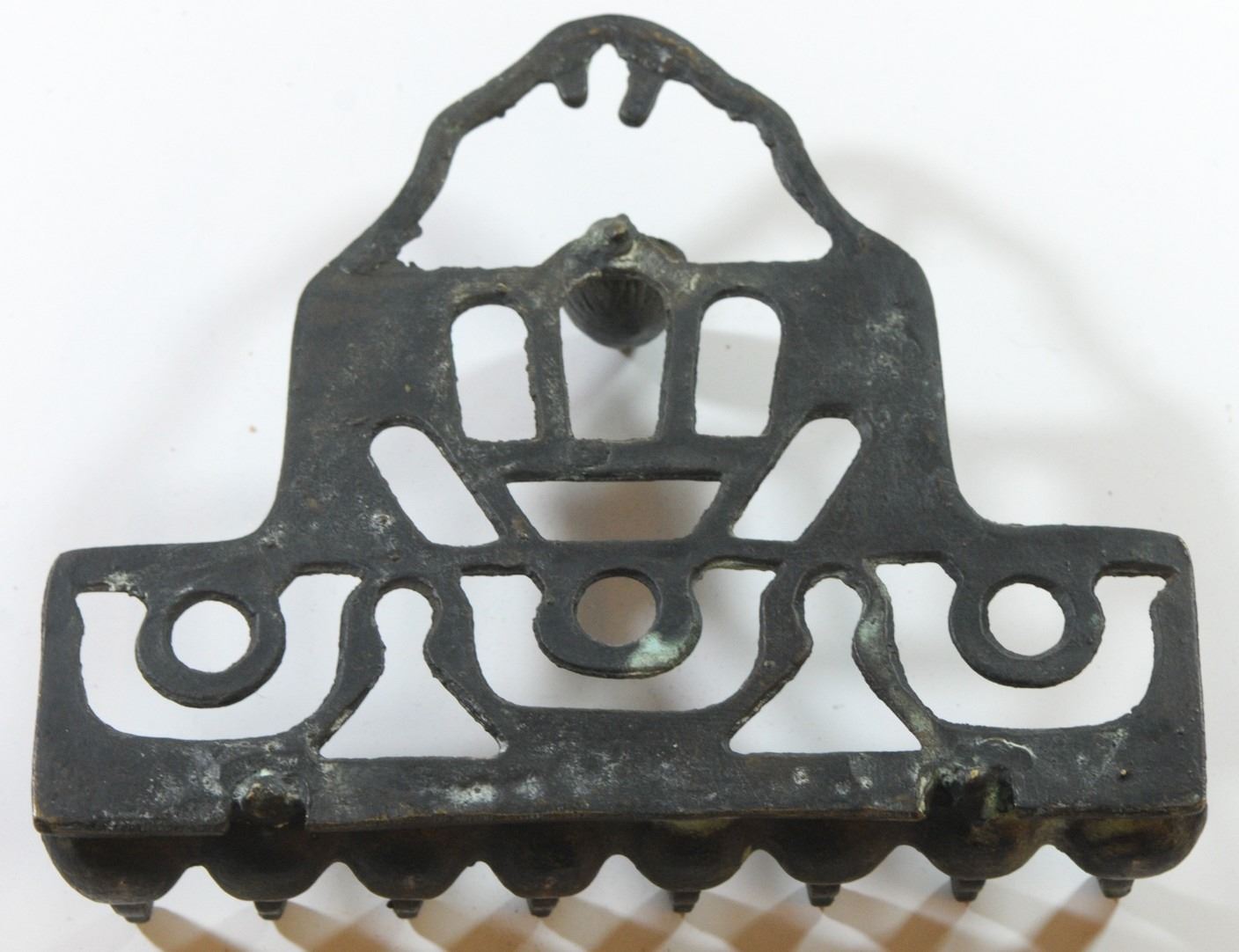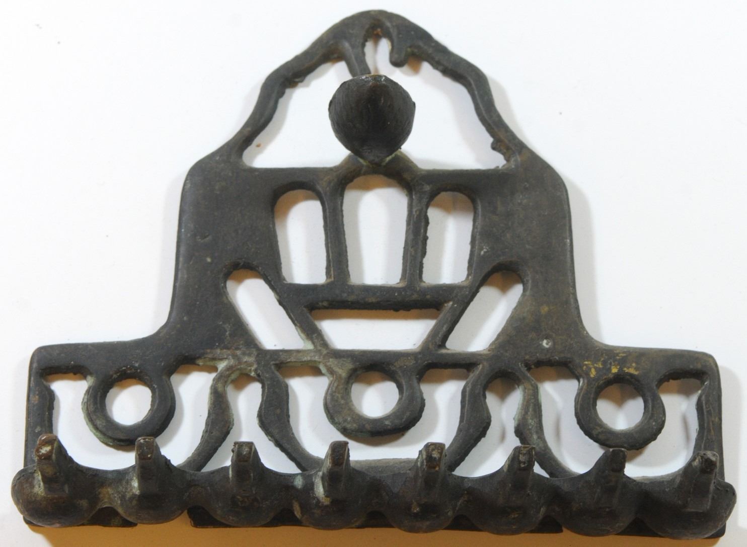 Old North African backplate Hanukkah menorah lamp, first half of the 20th century, brass, oil lamp, length: 20 cm.