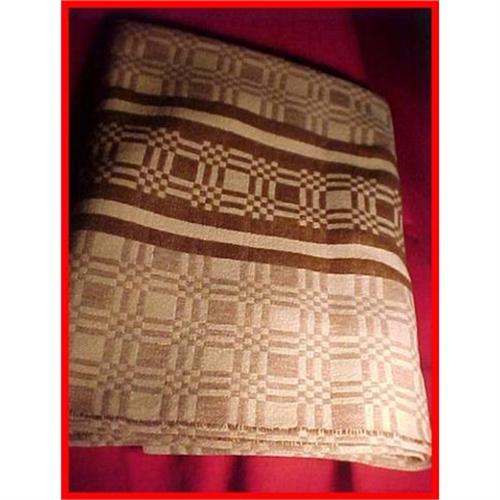 I was told that this 72" by 54" woven wool geometric coverlet/blanket was made by a Norwegian weaver. Beige and brown colors in this tightly woven textile. No maker's markings or tags. Unknown age; I would guess from the 1940's -1950's era. Fair condition with a slight stain(SEE PHOTO) and tiny overlaping hole(Hard-To-See). I bought this coverlet at an estate auction sale of an old woman(in her 90's) about 15 years ago.
