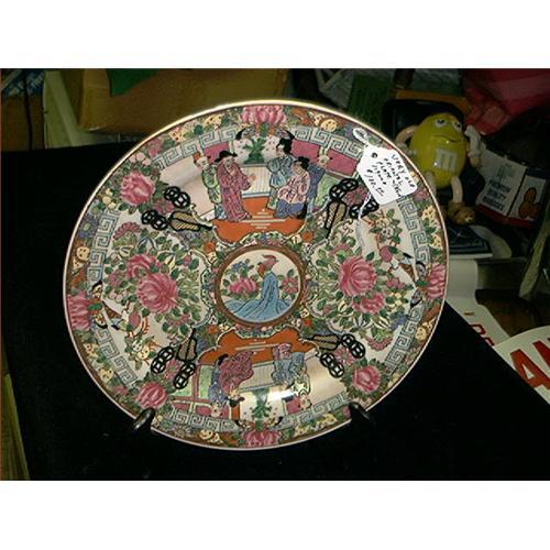 Beautiful Old Oriental Plate with Stand Signed. All hand painted and done up and detailed so nicely. It shows oriental couples all around the plate and covered with roses and flowers. Simply unreal as it is in perfect condition. It is showing that it is quite old and still very colorful and just stands out anywhere you place it. It is 10" Around and I don't think you will find a better one. It came out of a real beautiful estate and you really have to see it in person, to enjoy the art work and detail coloring and you know it just tells a story. It is signed with a large red square and oriental writing on it. It has gold trim on it and I just can't say enough about this one. Great gift item to any collector who collects items like this. They would love you forever, its that beautiful. If you like old oriental plates, then take a real good look at this one. Very colorful and truly a class piece.
