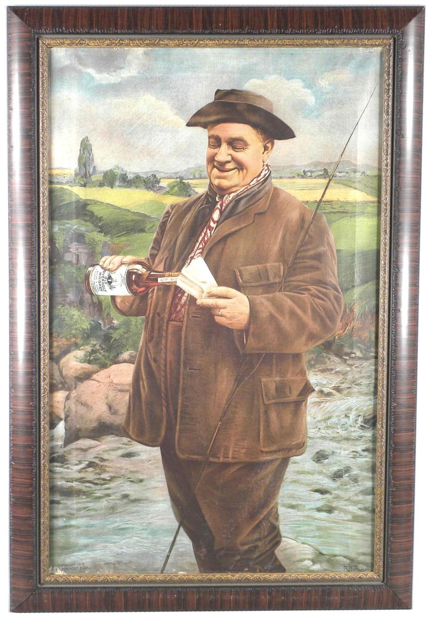 Old Overhold Whiskey Canvas Sign. Depicting fisherman pouring a glass. Copyright 1919. R. Bohunck, artist. Slight wear at lower left corner otherwise very good condition. Contemporary frame. 19 X 30 inches image only.