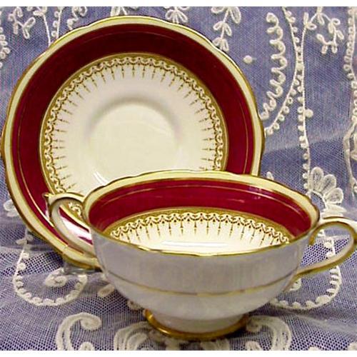 This is Beautiful Paragon 2 piece set made from fine Bone China,England, Named "ATHENE", Purchased in late 1930's, Love the rich burgundy vine color and lots of intricate gold decorations - Set consists of wide open 2 handle cup fully decorated on inside,and matching saucer - Very good condition, free of chips, cracks or repairs, there might be some surface scratches on the saucer ( from the use), visible only when you tilt it against the light, BEAUTIFUL ! - US Buyer to pay 7.00 for insured shipping - Thank You very much for looking!