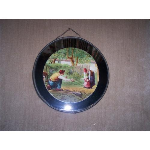 Another great old flue cover.This one depicts a mother and father with a small child that perhaps is learning to walk.Looks like they live on a farm.These are all old flue covers,not the new repros that are out there.This one measures 7 3/4" across.