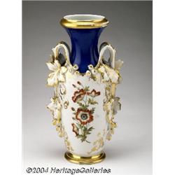 Old Paris: <B>A FRENCH PORCELAIN HANDLED VASE (Old Paris) </B></I><BR>Old Paris, c.1890<BR><BR>The cobalt blue ground with heavy gold gilt leaves and berries, applique handles, the center panel hand painted with multi-colored floral design, <I>unmarked</B></I><BR>19.3in. high <BR><BR><B>Important notice:</B> Heritage usually auctions material at the rate of 200-250 lots per hour. On some occasions eBay Live bid software or the Internet may not be able to keep up with the pace of the auction. We recommend placing a realistic absentee bid now as insurance to avoid disappointment. Occasionally the auctioneer may eliminate or reject an eBay Live bid, and the auctioneer may also reopen a lot after the close of the eBay live bidding (usually because we missed an audience bid), and may reject your bid even if it shows you as the winning bidder. By bidding via eBay Live, you agree that Heritage may award the lot to another bidder at its sole discretion under the circumstances described above or any other reasonable circumstances. Since eBay bids are not shown to us until we open the lot on the floor, we treat those bids just like floor bids. In most cases the floor responds before the eBay bid is presented to us, due to Internet lag time, so for consistency we have made it a policy that floor bids are always considered first over tie eBay live bids. Also please note that all Heritage lots purchased through eBay Live carry a 24.5% Buyer's Premium. Please make sure you read the Terms and Conditions before you bid.