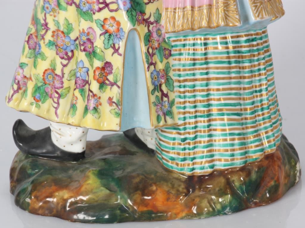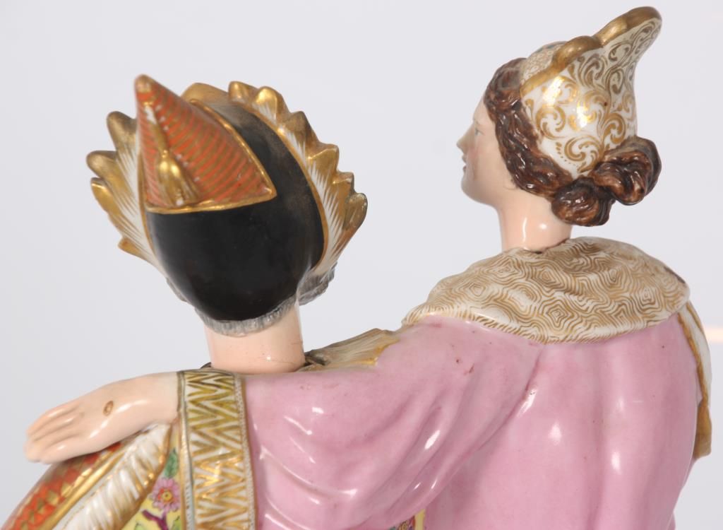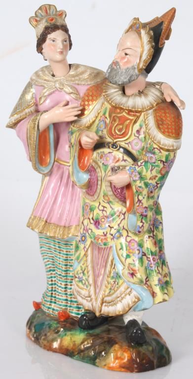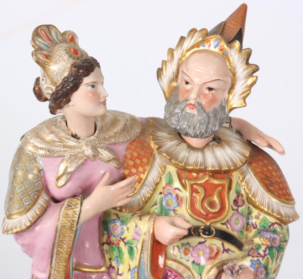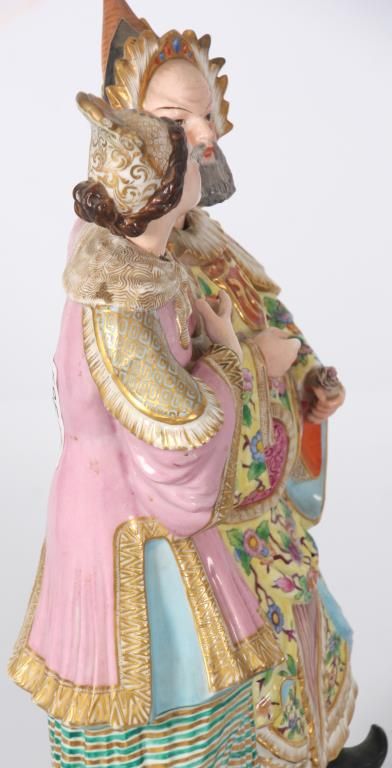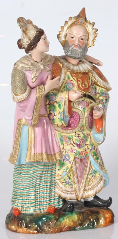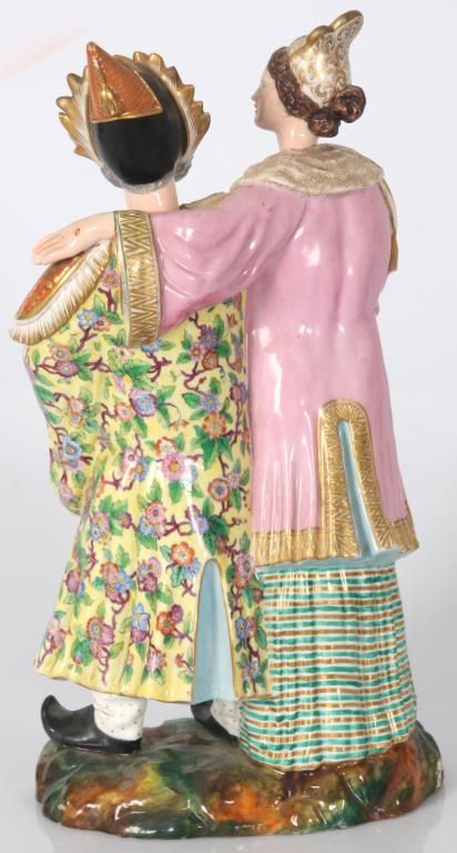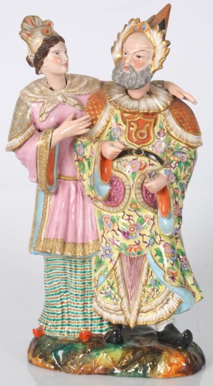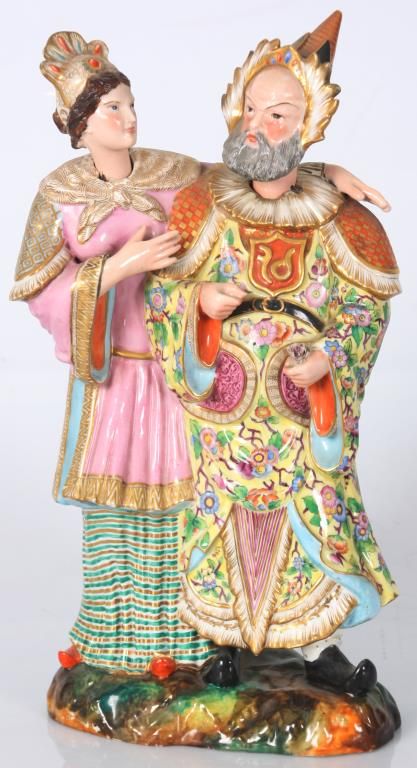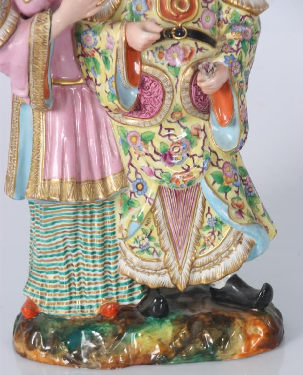 Old Paris Figural Porcelain Nodder Grouping. Standing figure of a Chinese man and woman side by side, the woman stands to the right of the man with her left arm resting across the back of his shoulders; figures wear colorful clothing with gilt and floral designs, man holds a flower, their nodding heads are rested on their shoulders. Signed with initial JP under the base. Hairline across the back and chest of the man, flower has damages to the petals. 14 in. high.
