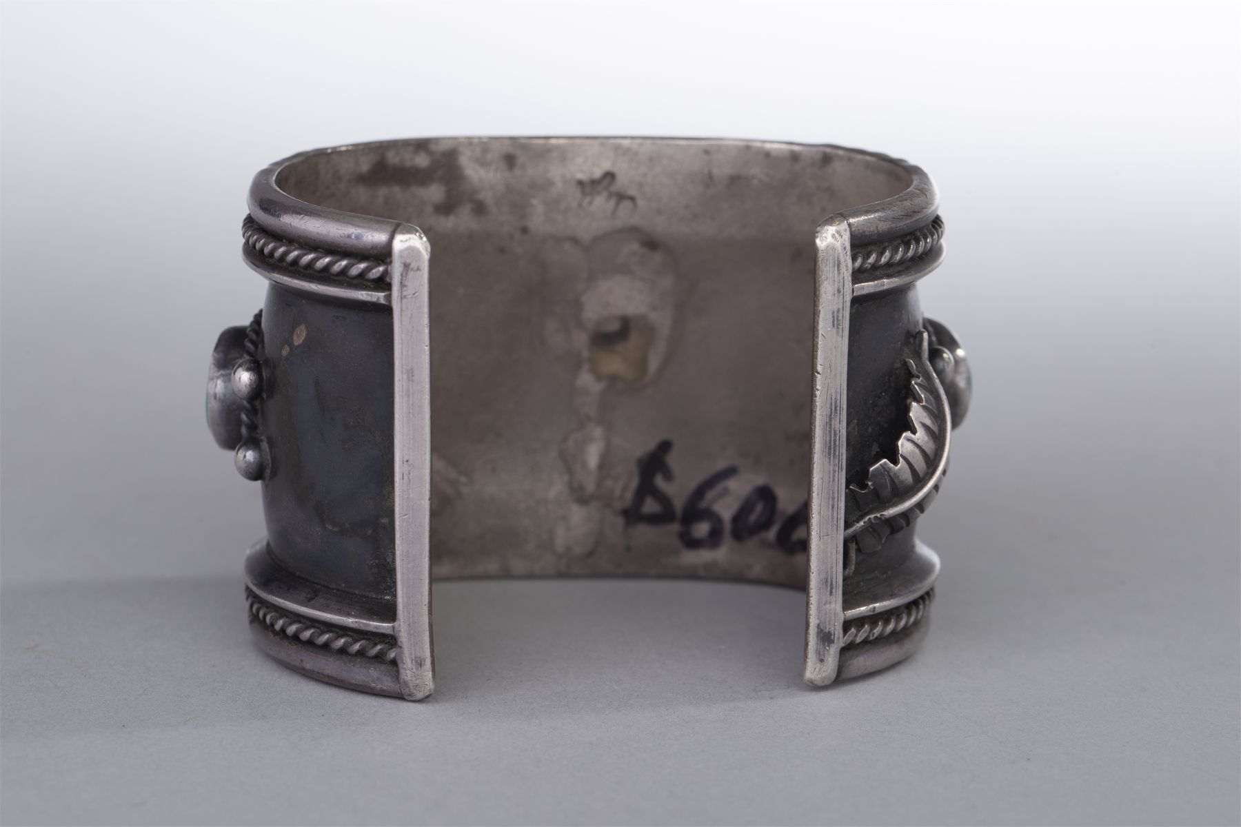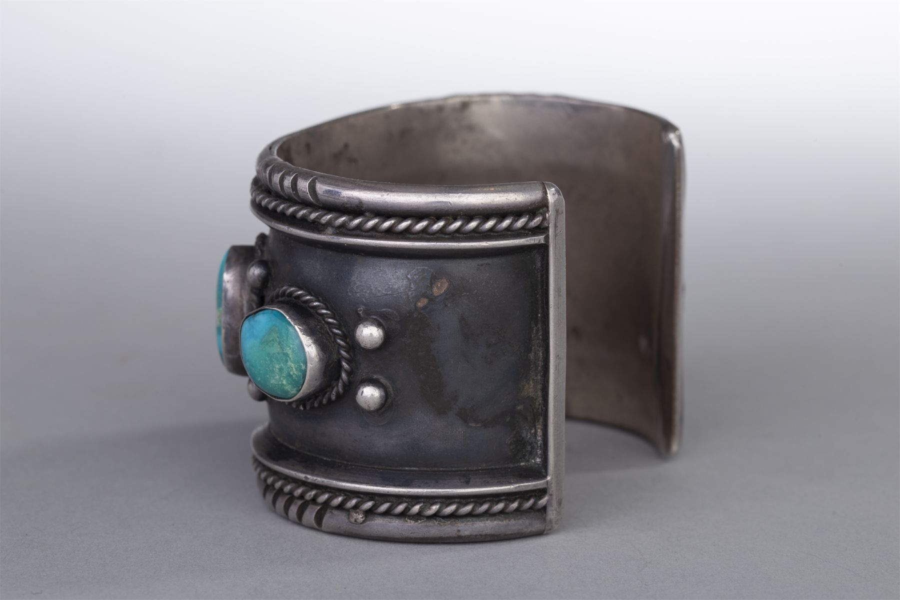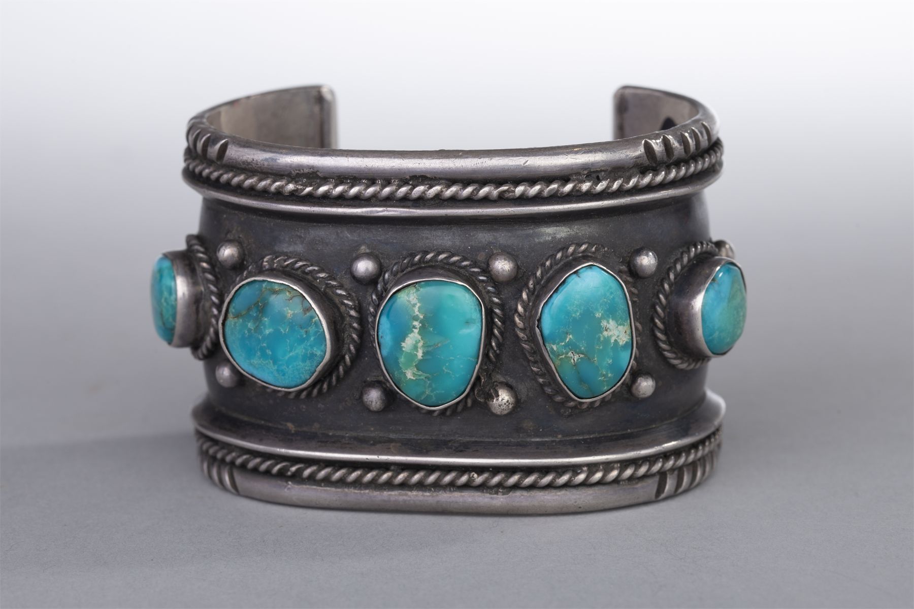 Navajo "Old Pawn" turquoise bracelet with 5 great natural turquoise stones and silver drops and silver leaf on one side.