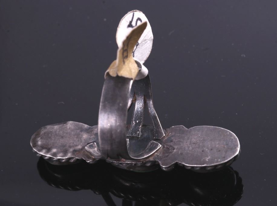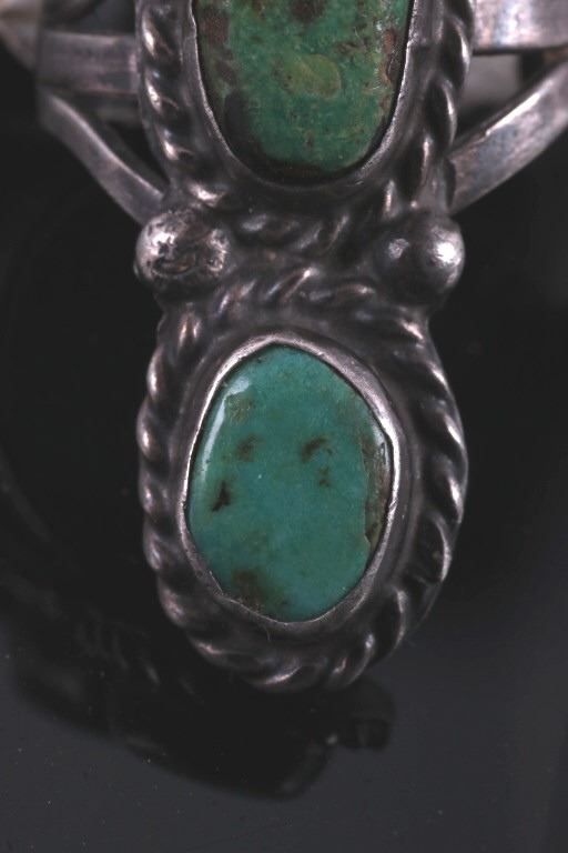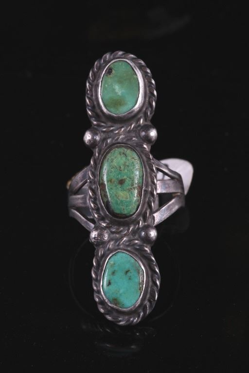 For your bidding pleasure is an Old Pawn Carico Lake turquioise tri stone ring. Carico Lake turquoise is named after the location of its mine on a dried up lake bed in a high, cool area of Lander County, Nevada. Carico Lake turquoise is also found in a dark blue-green color with a black, spider web matrix. The ring has three individual Carico Lake turquoise gem stones set in a linear fashion. Ring measures size 6 1/4 US.