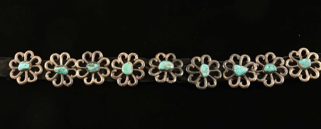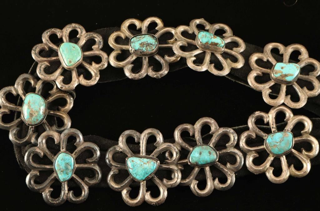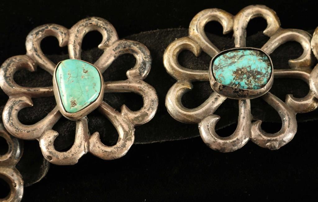10 Floral design conchos all with a single turquoise stone on black suede belt.