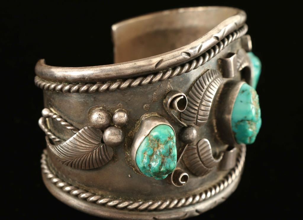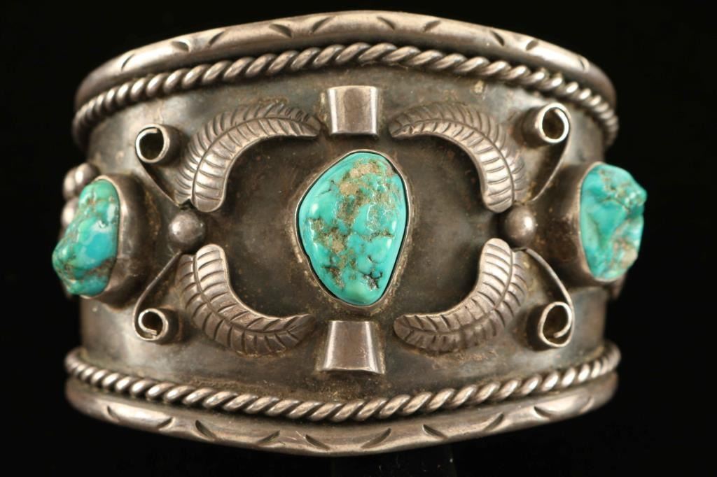 Unique leaf design cuff with three natural turquoise stones. Measures 2" wide, inside 5 1/2" with a 1 3/8" gap.