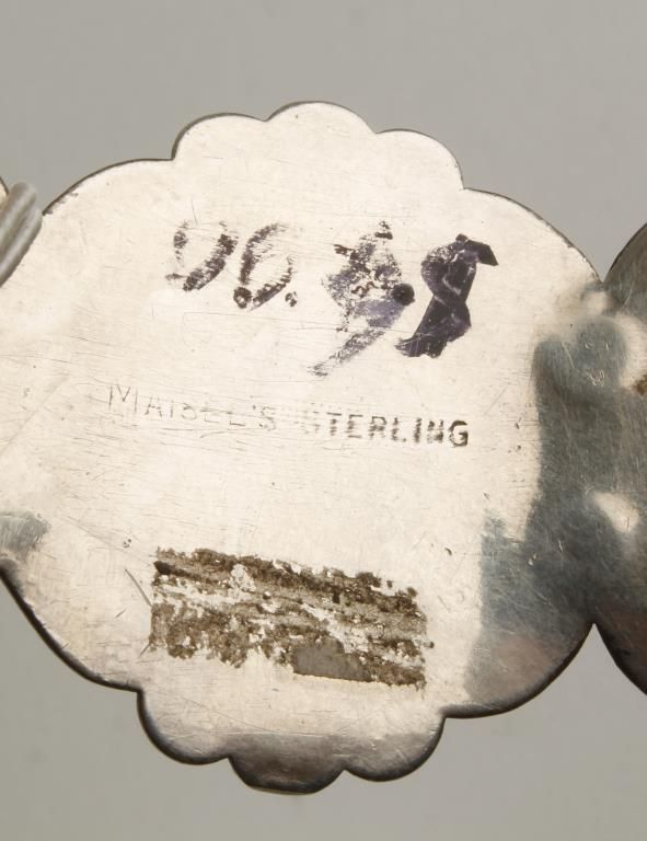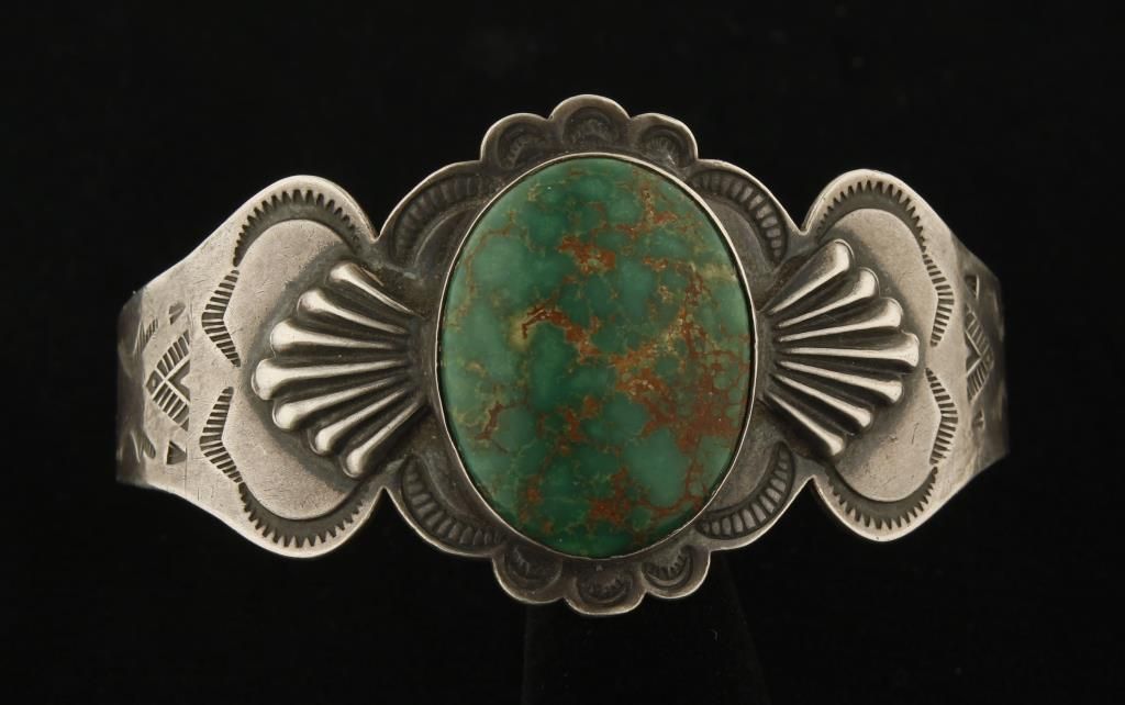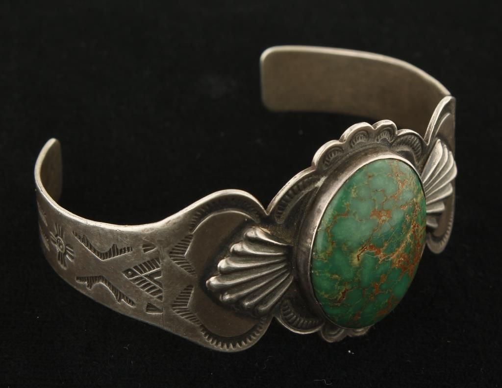 Large oval turquoise stone in sterling silver cuff with eagle, arrow, and sun design. Marked Sterling. Approx 2-1/2" inside measurement with 1-1/2" gap, but could easily be reshaped.