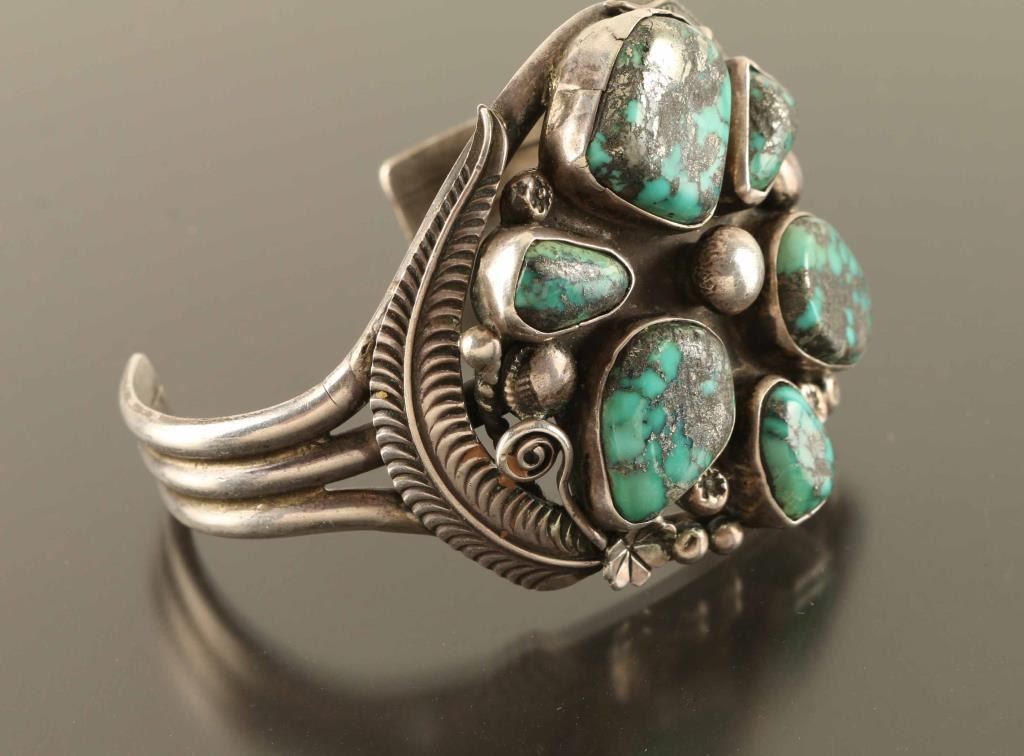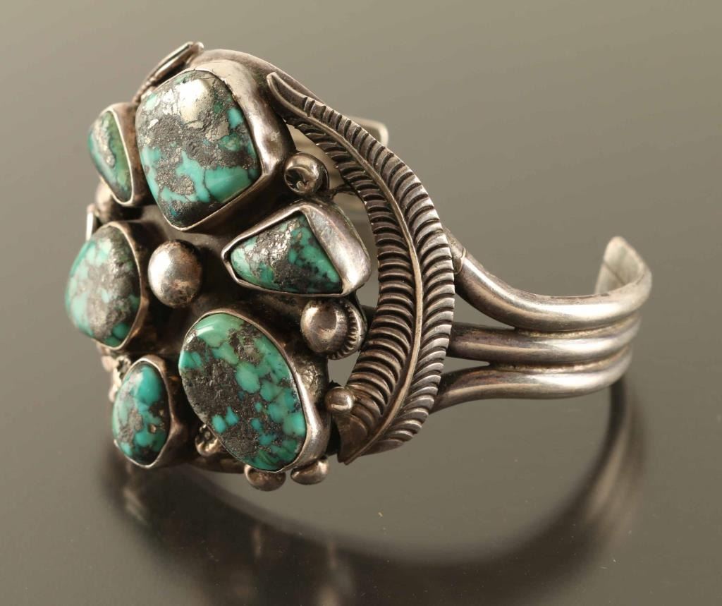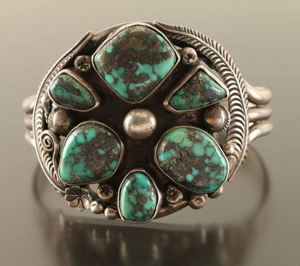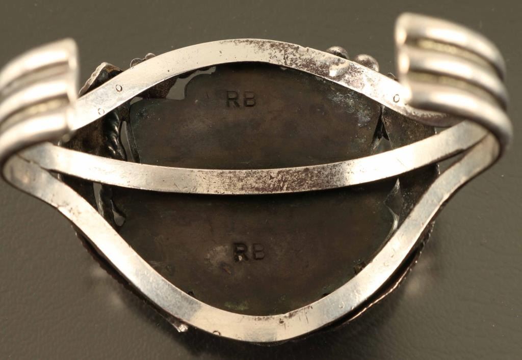 All sterling maker marked "RB" for Richard Begay. Beautiful turquoise in a classic design.