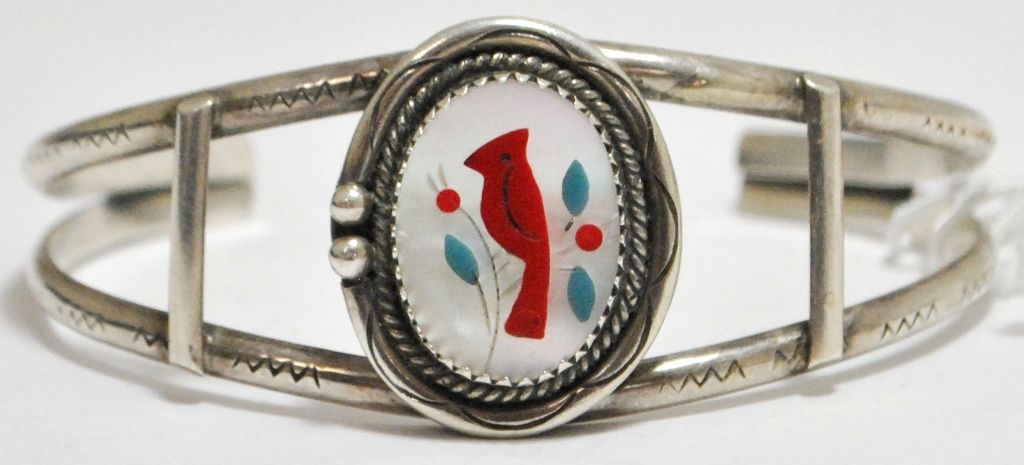 Measures 5-1/4" around with a 1-1/4" gap, 1" wide. Stones present: Mother of Pearl, Turquoise, Coral.