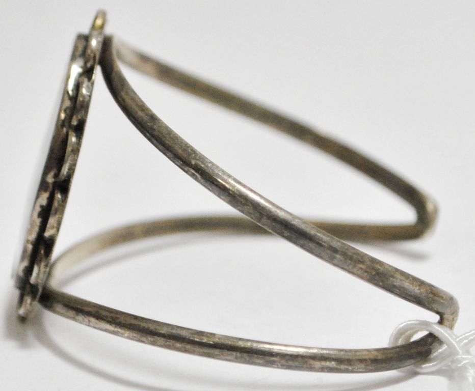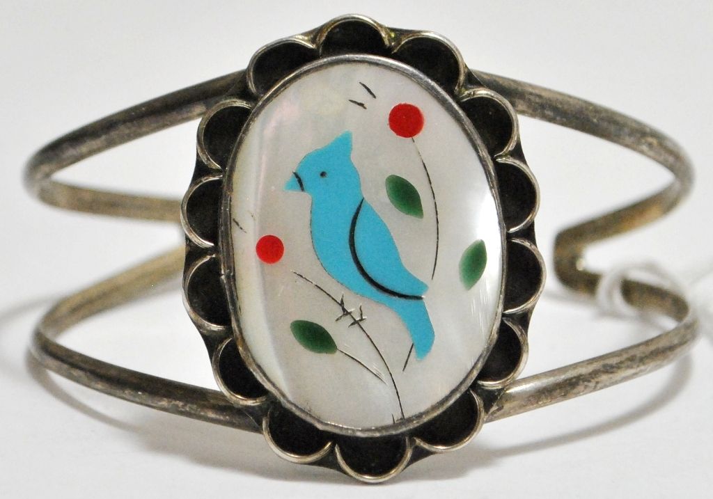 Measures 5-1/8" around with a 1-1/4" gap, 1-1/2" wide. Stones present: Mother of Pearl, Turquoise, Coral, Malachite.