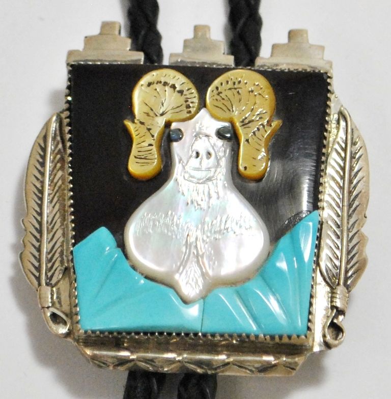Old Pawn Multi-Stone Inlay Goat Sterling Silver Bolo Tie & Buckle Set - J Quam