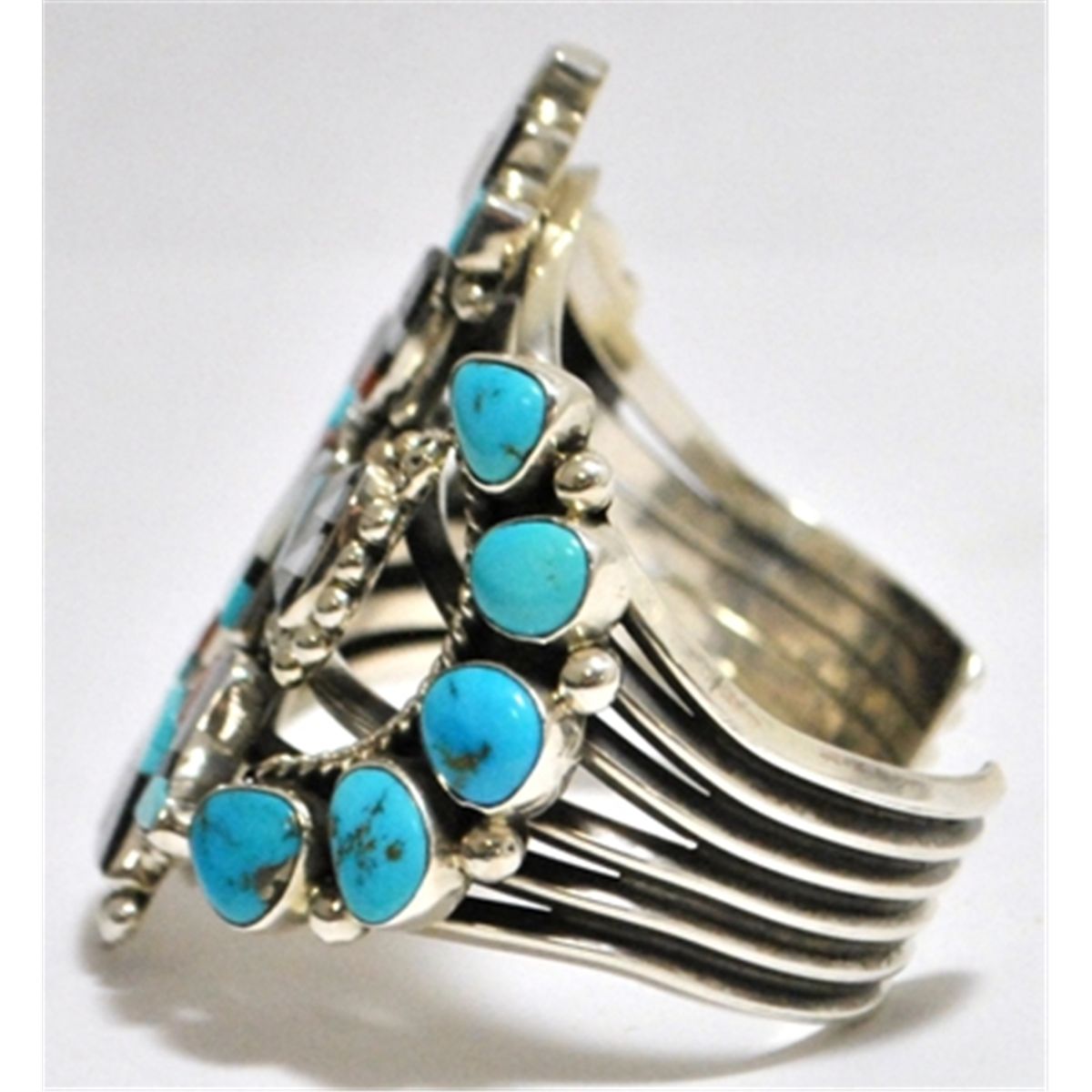 Measures 5-3/8" around with a 7/8" gap, 2-3/4" wide. Stones present: Mother of Pearl, Black Jet, Coral, Turquoise.