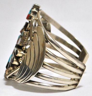 Measures 5-1/4" around with a 1-1/8" gap, 2-1/2" wide. Stones present: Mother of Pearl, Black Jet, Coral, Turquoise.