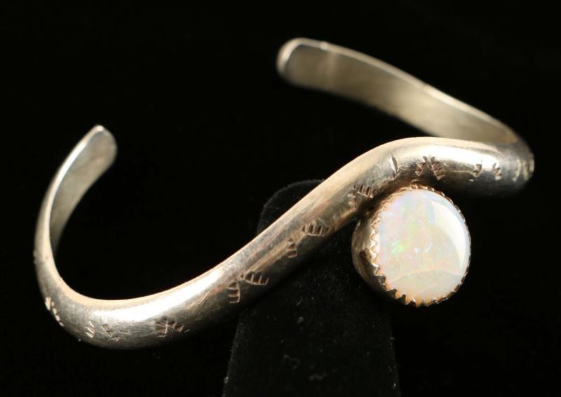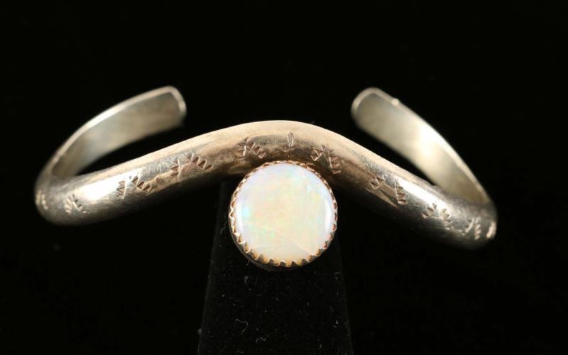 Hammered sterling with a geometric design suspends a circle drop of opal. Unsigned. Opal is cracked but stable. 1/4" wide x 5 3/4" l plus a 1" gap.