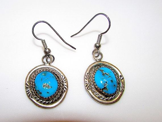 For your consideration is a pair of these gorgeous vintage Old Pawn Navajo sterling silver and Kingman mine turquoise dangle earrings in wonderful vintage condition. These stunning earrings feature a classic Navajo design in sterling silver accented with intense blue oval turquoise cabochons. The earrings have no visible artist's hallmark as most Native American jewelry from the time period and are marked sterling. The earrings are a pierced type and measure over 1 1/2" long including hooks by about 3/4" wide at the widest point. Fabulous addition of vintage Native American Art to add to any collection!
