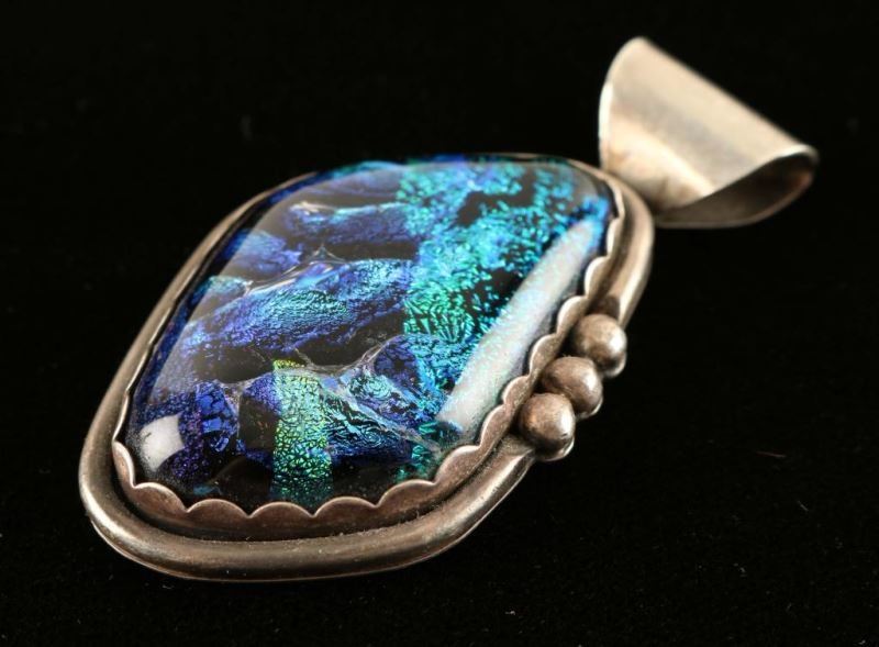 Ammolite and Sterling, 2 1/8" long and 1 1/8" wide. Signed 'DT F02' and stamped '.925'. A very striking statement piece.
