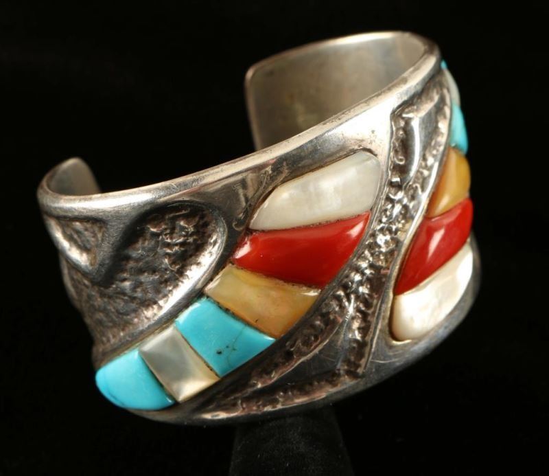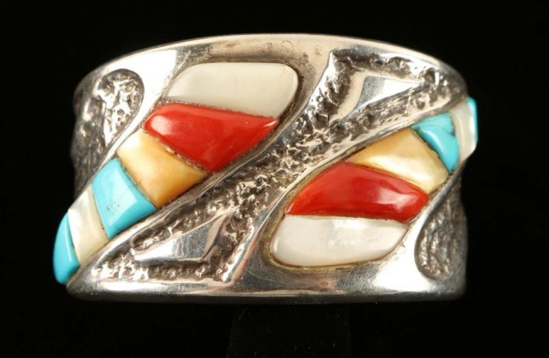 Inlaid with turquoise, coral, and mother of pearl on a freeform design engraved Sterling cuff. Pre 1970s. Measures 1 3/8"w x 5 3/4"l plus a 1" gap. Very unique piece.