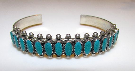 For your consideration is this fabulous vintage Old Pawn Zuni sterling silver and turquoise cuff bracelet in wonderful vintage condition. The bracelet features a classic "snake eye" design in sterling silver accented with a row of old turquoise cabochons with nice patina. Theca features a hand etched traditional tribal design on the sides. The cuff measures about 6 1/2 inside circumference and can be carefully adjusted. Marked sterling. Weighs 23gr. No visible artist's hallmark. Wonderful, rare addition to any jewelry collection!