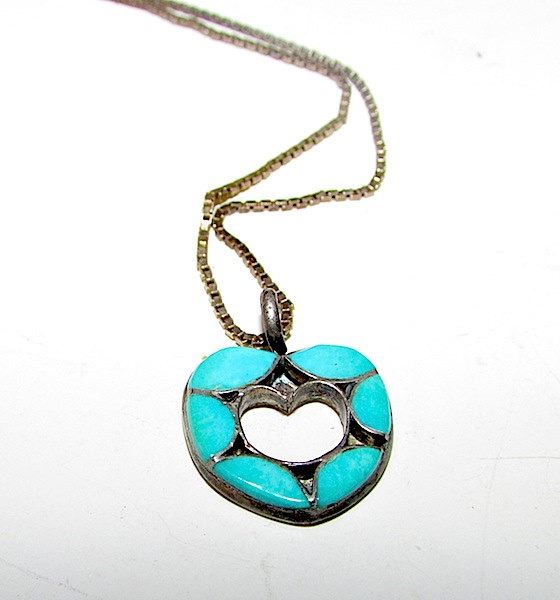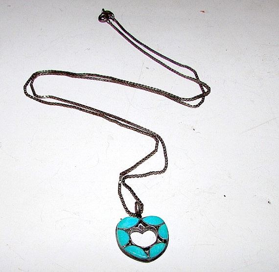 For your consideration is this exquisite Old Pawn Native American Zuni sterling silver and mosaic inlay turquoise pendant necklace in wonderful vintage condition. This fabulous piece features a heart shaped design in sterling silver accented with Sleeping Beauty mine turquoise inlay. The pendant is unmarked as all Old Pawn jewelry and has been tested for silver content. The pendant measures a little under 1" and the necklace is about 18" long including pendant. Stunning example of vintage Native American art to add to any collection!