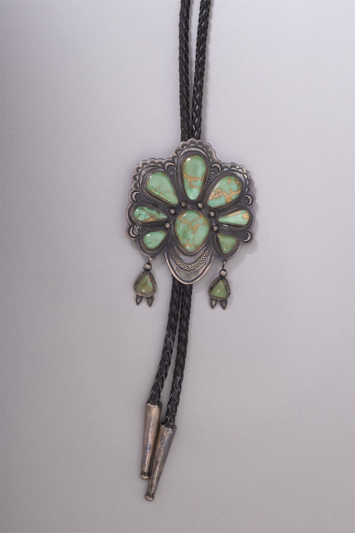 Navajo black bolo tie with sterling silver clasp holding 10 green turquoise stones finished with silver cones.