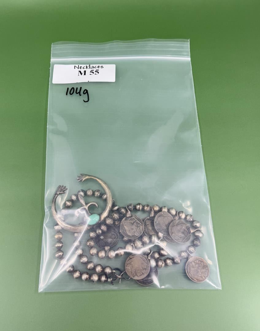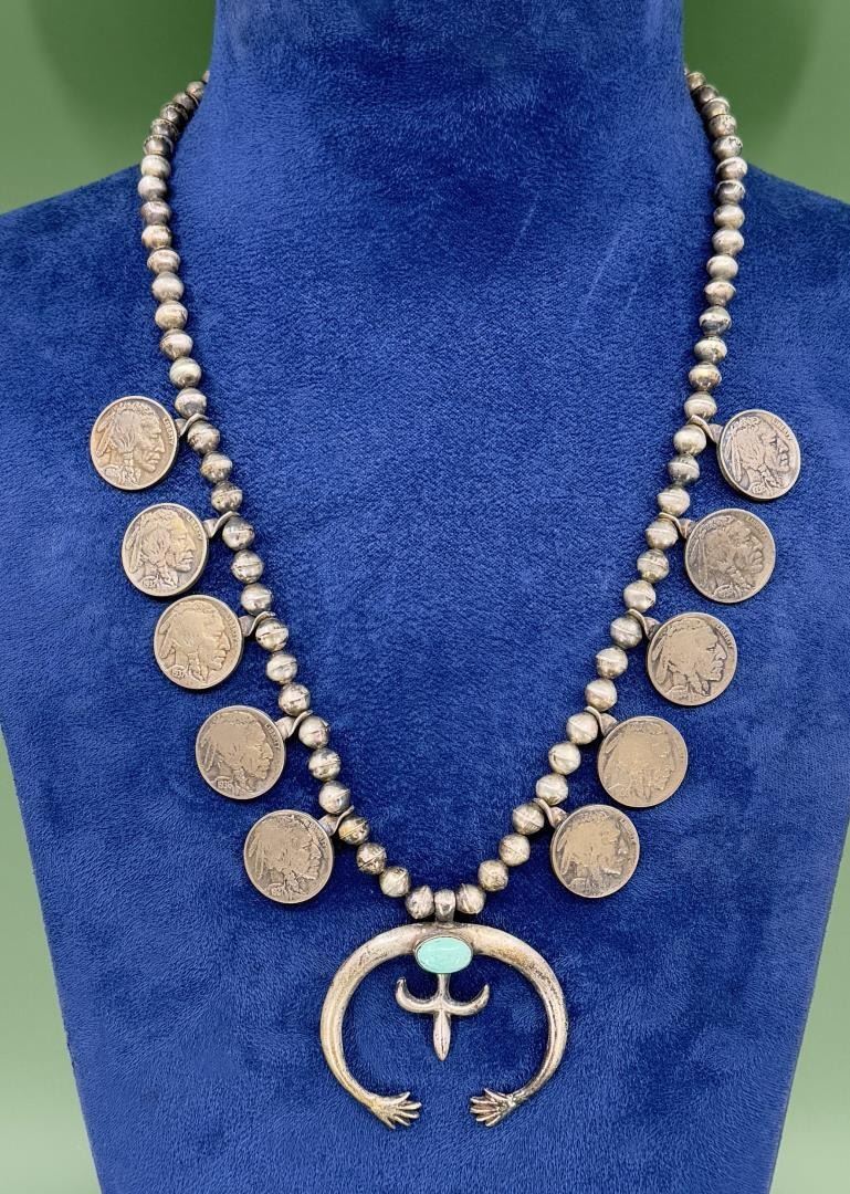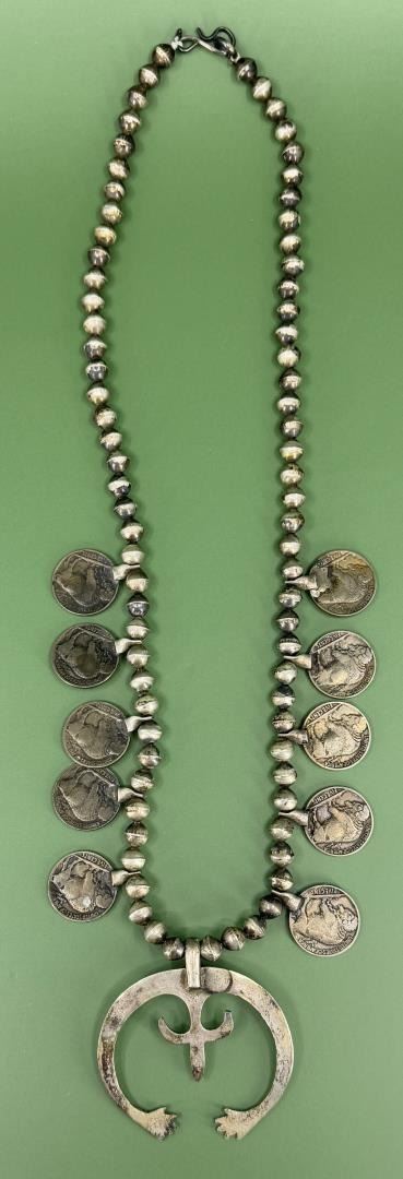 Nice Old Pawn Sterling Silver Bench Bead and Naja, drops are all buffalo nickels. 14 1/8" long. 104 grams.
