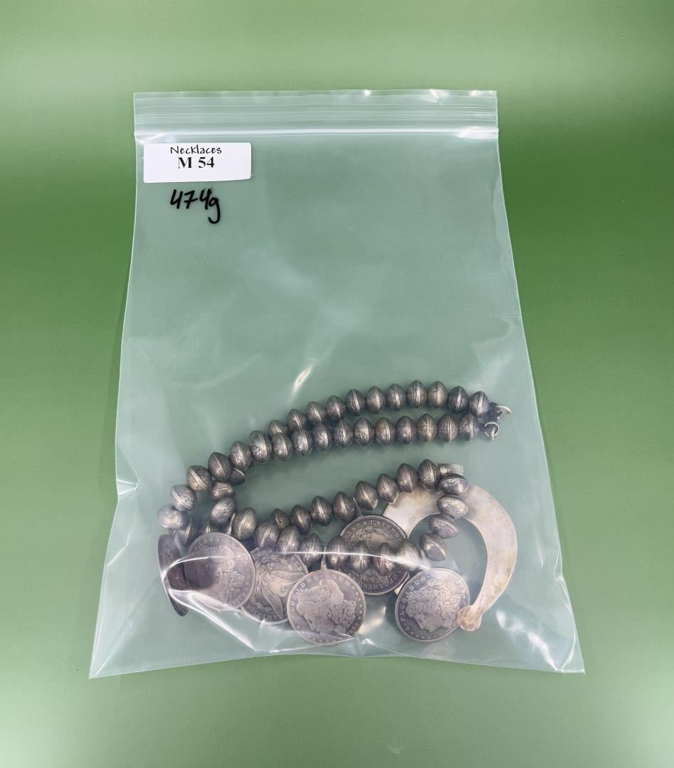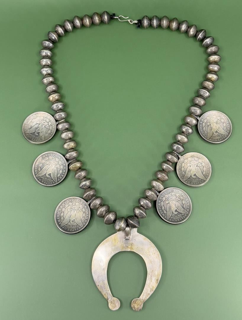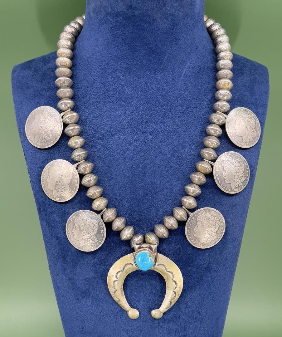 Large and impressive. Mercury Dime Beads, Morgan Dollar drops, large Naja set with Turquoise. 15 3/4" long. 474 grams.