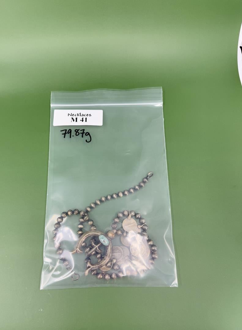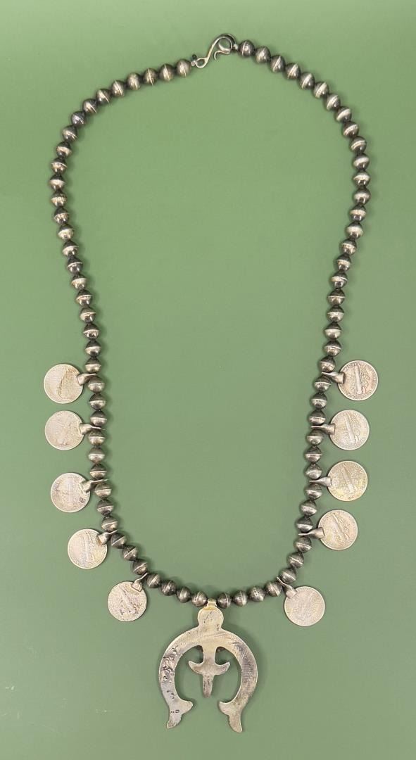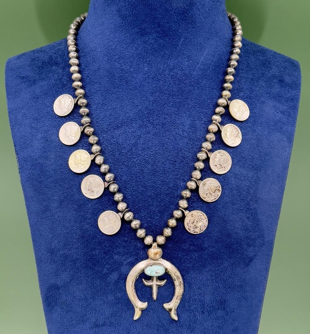 Tufa Sandcast Naja set with Turquoise. Mercury Dime Drops. 14 3/8" long. 78.87 grams.