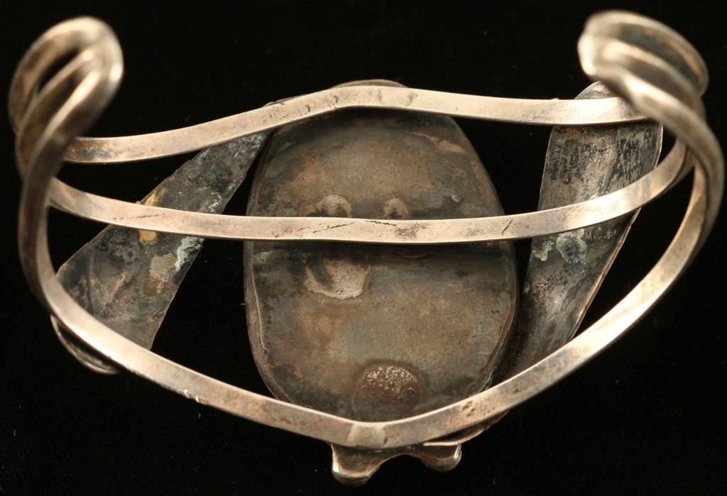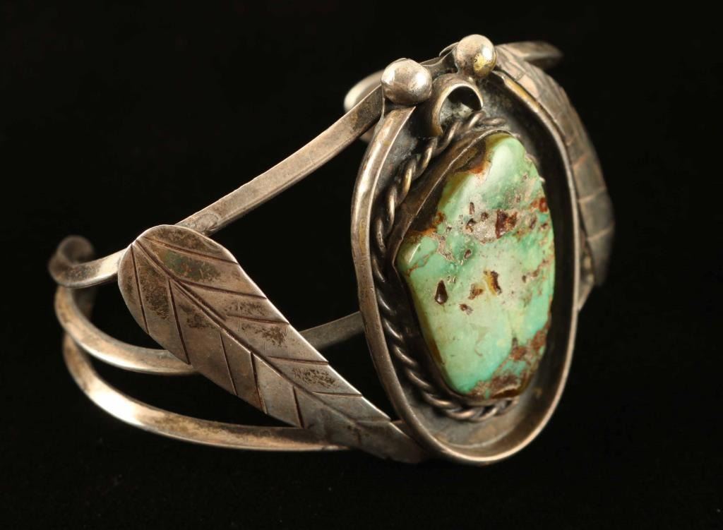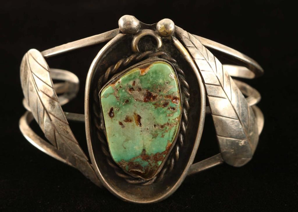 with single green turquoise cab set in sterling silver. Unsigned. Measures 6" with a 1 5/8" gap.