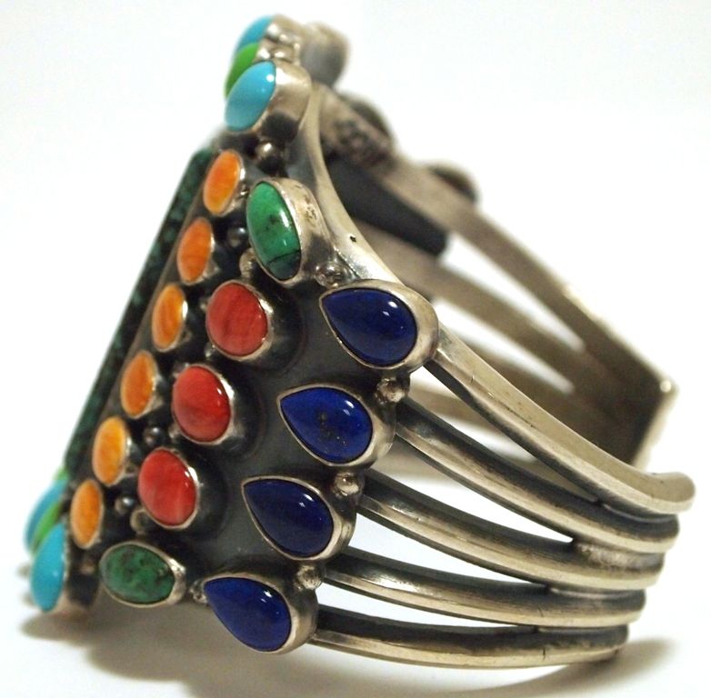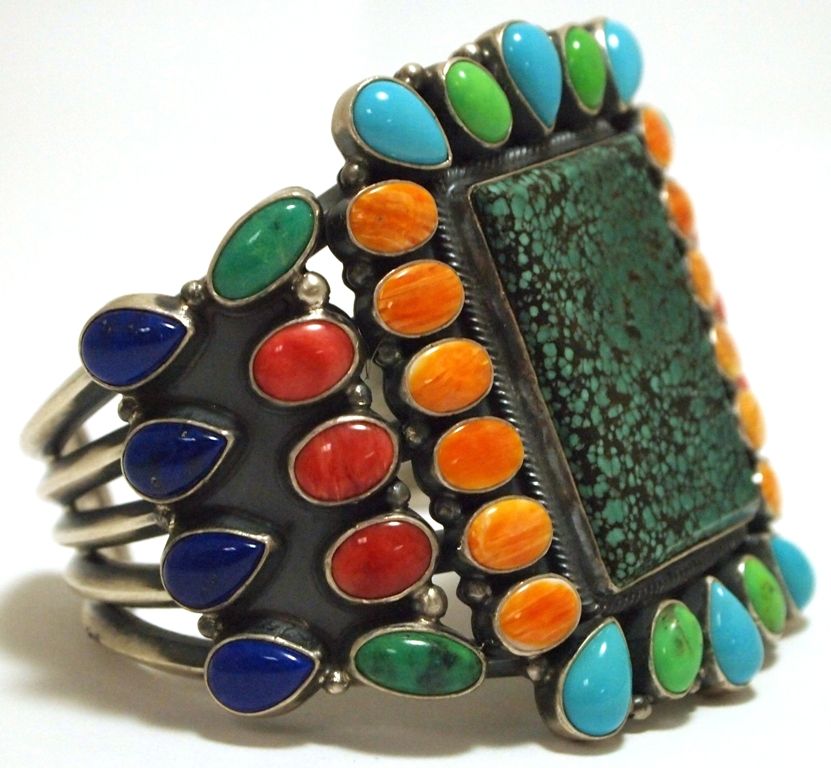 Measures 5-1/8" around with a 1" gap, 2-1/8" wide. Stones present: Spiny Oyster, Malachite, Gaspeite, Spider Web Kingman Turquoise, Turquoise, Lapis Lazuli.