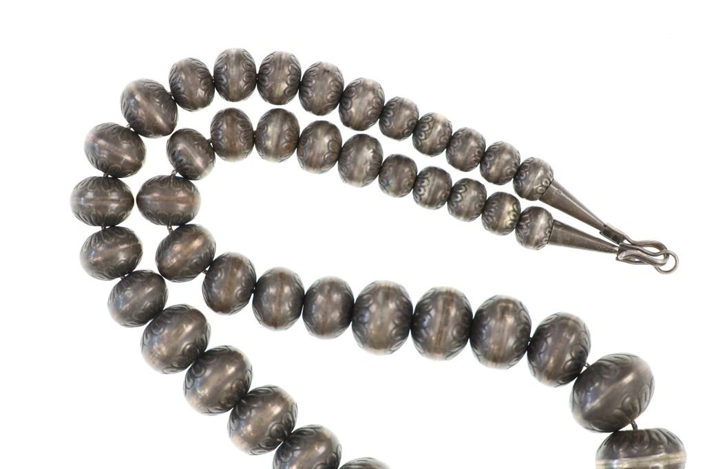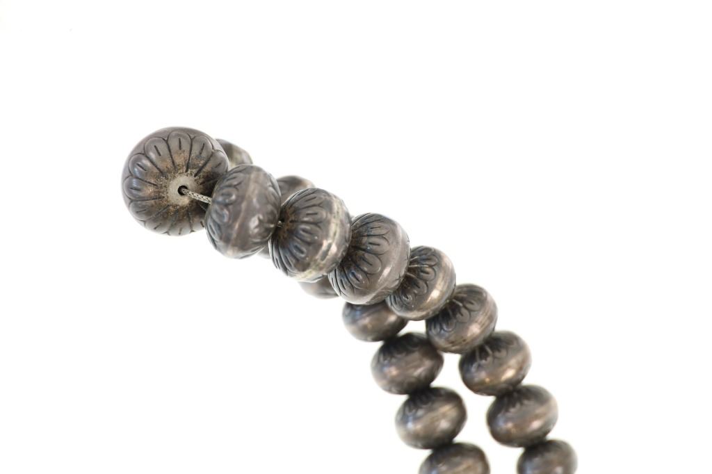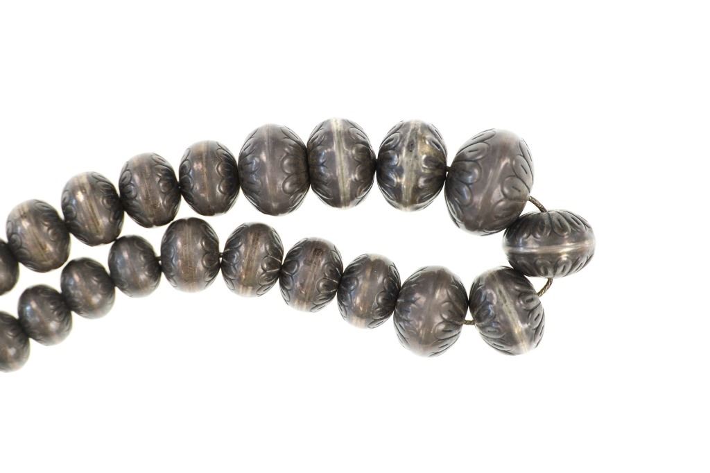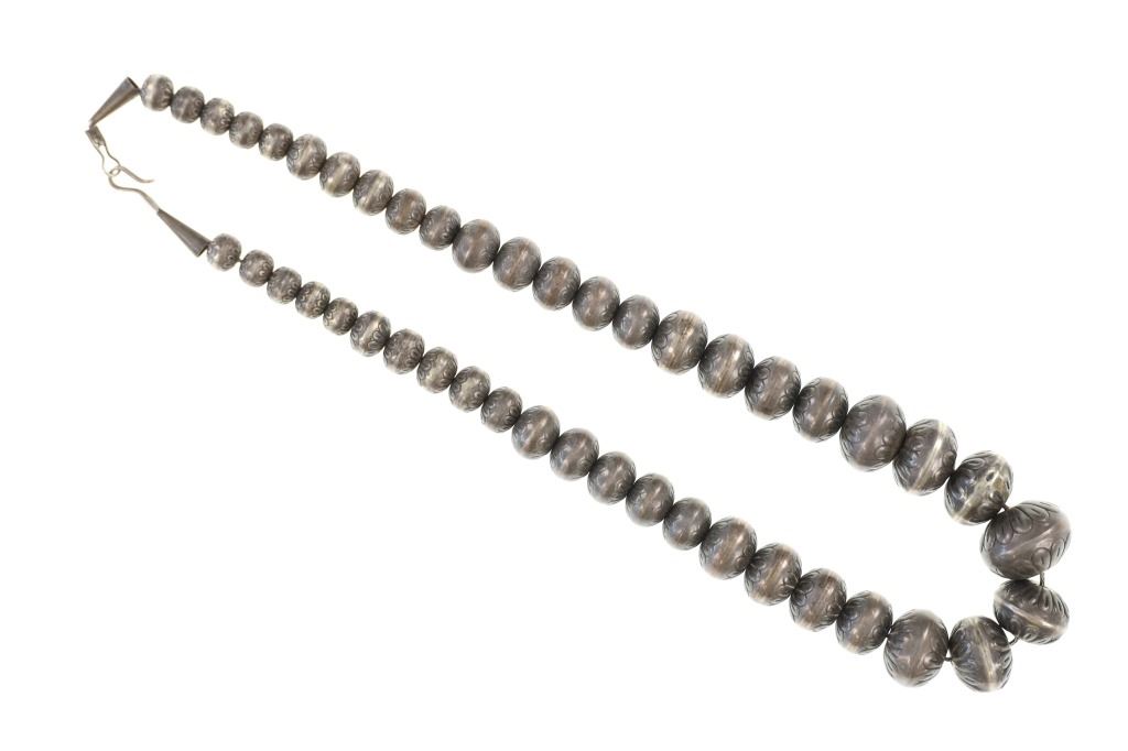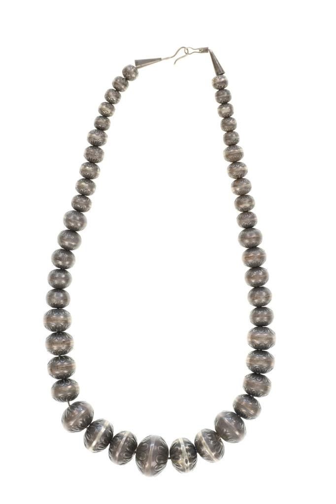 This is a fantastic Old Pawn Navajo pearls stamped graduated silver necklace. The set is strung on silver chain link strand with a classic older clasp and silver cone end. The pearls, sometimes referred to as stamped saucer beads / concho beads / concha beads / Navajo pearls / pound beads, are graduated with the largest bead at the bottom and smallest at top. Total of fourty-five beads all with a nice stamped and repousse design. The necklace dates to circa 1940-1950's and has a nice patina. Measures overall 18.5-inches from end of clasp to end of clasp. Total weight of 61.4 grams.