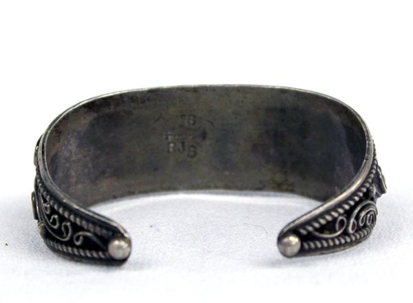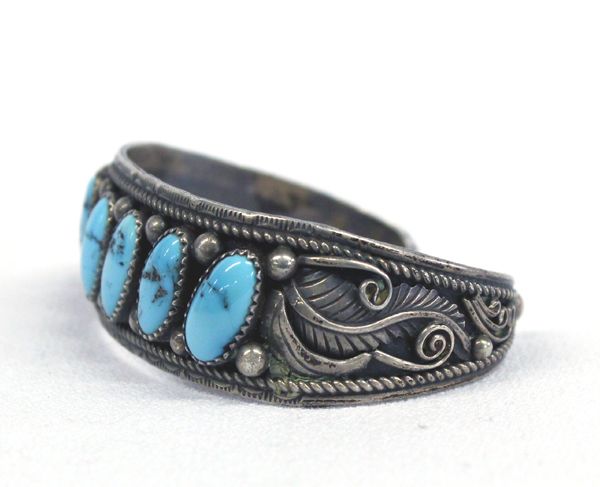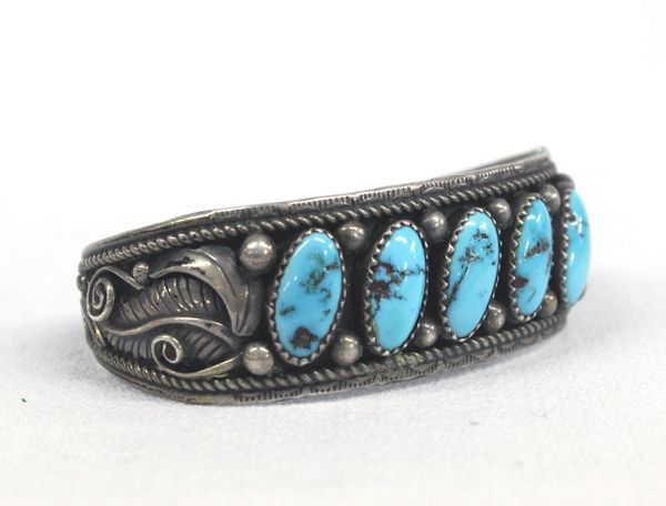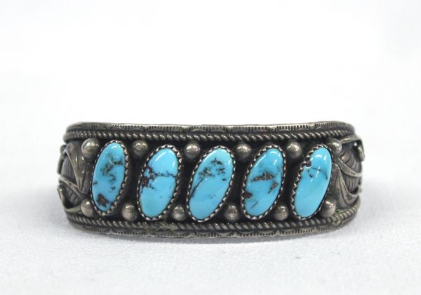 Old Pawn Navajo Silver Kingman Turquoise Bracelet by John Strong and Raynard J. Scott, stamped sterling and hallmarked TS and RJS, inside measures 6'' which includes opening by 1''W, features 5 sawtooth bezel set Kingman Turquoise cabochons measures 9/16'' x 3/8'', very traditional setting of leaves, scrollwork, and silver bead accents, 26.32g in total wt.