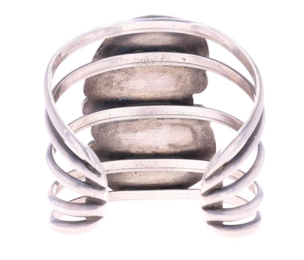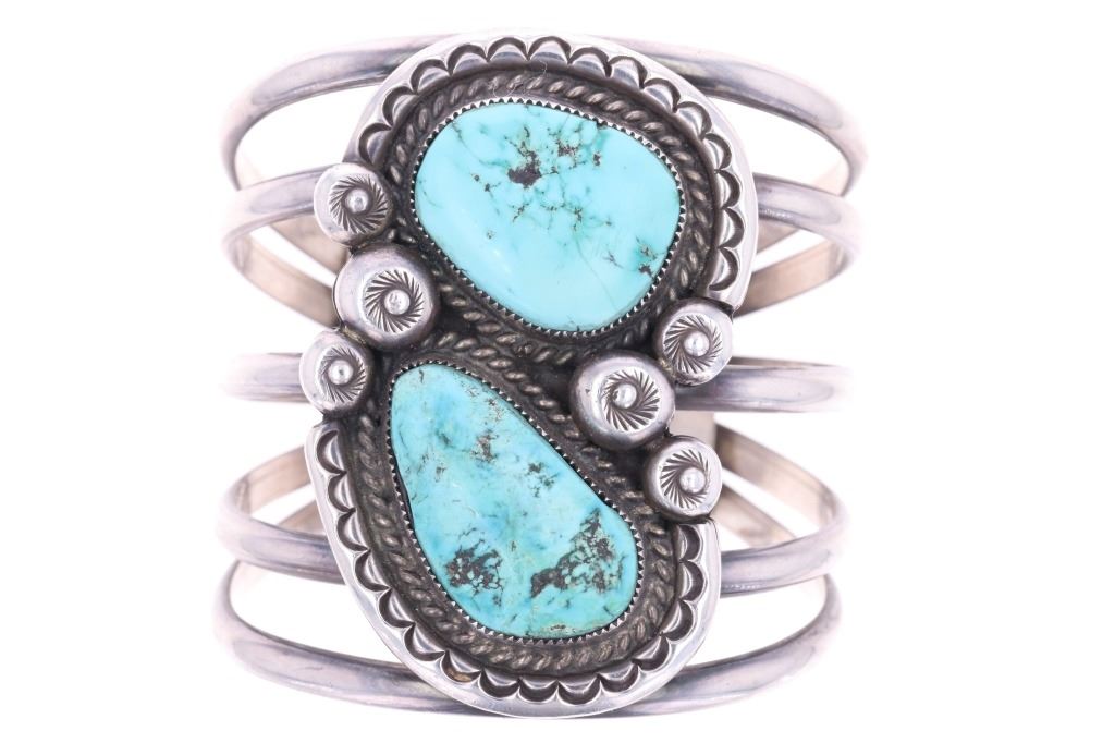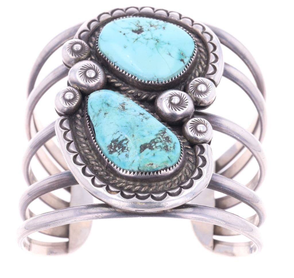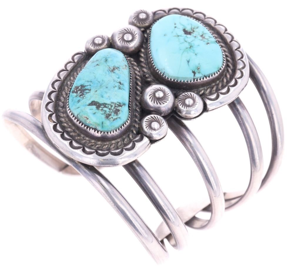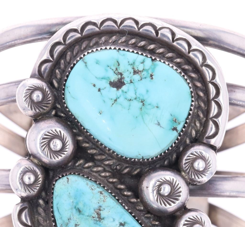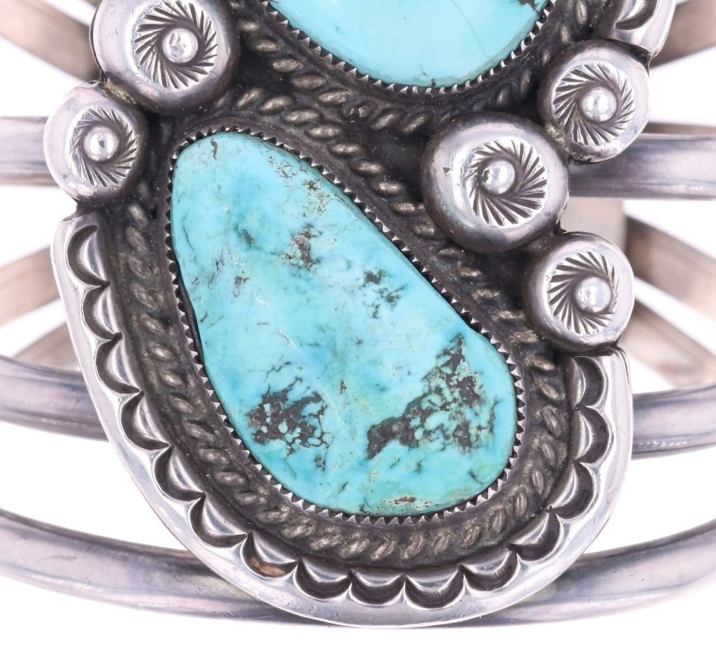 This is a gorgeous old pawn Navajo bracelet set with beautiful natural sleeping beauty turquoise and heavy silver. The bracelet dates to circa 1940-1950’s and shows two early natural, non-stabilized gem quality turquoise from the Sleeping Beauty Turquoise mine. The turquoise is set with a heavy silver deeply stamped setting on a four silver bar cuff design. The condition of this Navajo bracelet is good with no obvious signs of damage and shows good overall condition. The measurements of this bracelet is 2" x 2 3/8" x 2 1/4" and the circumference of this bracelet is 4 1/2". The collective weight of this bracelet is 88.9g.