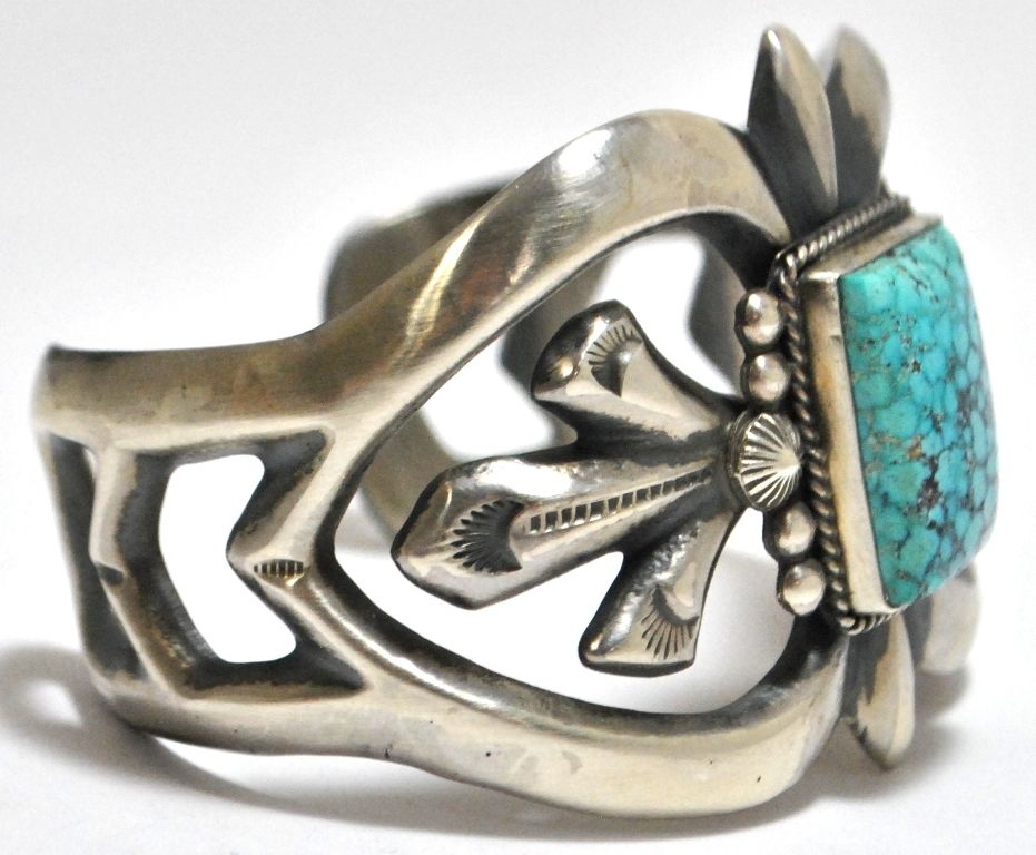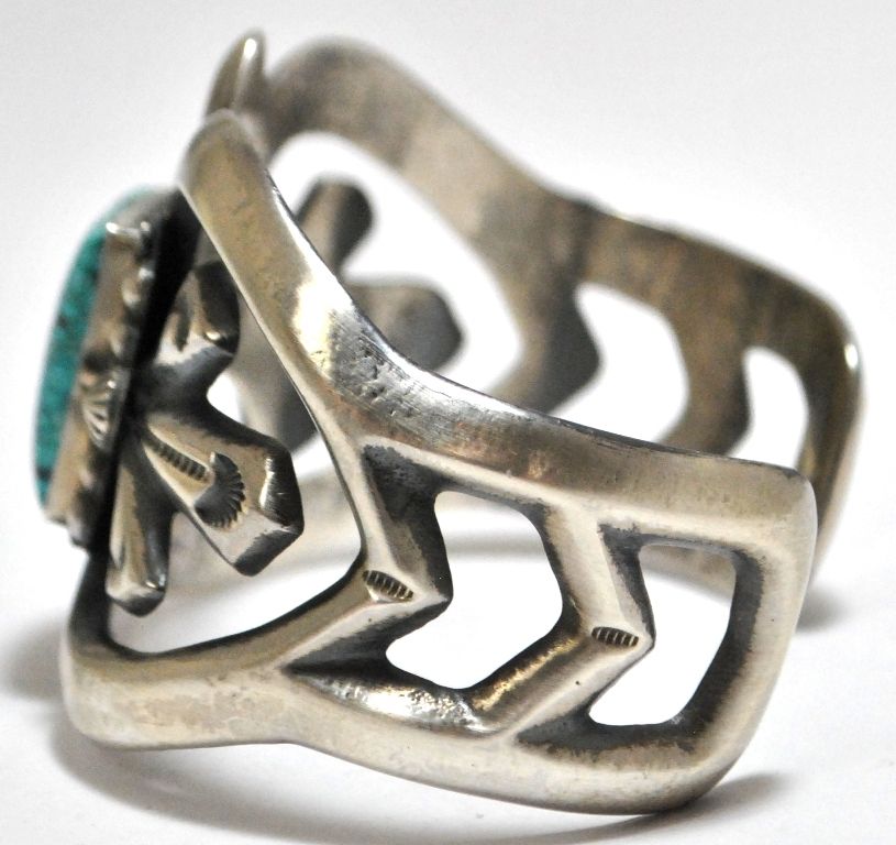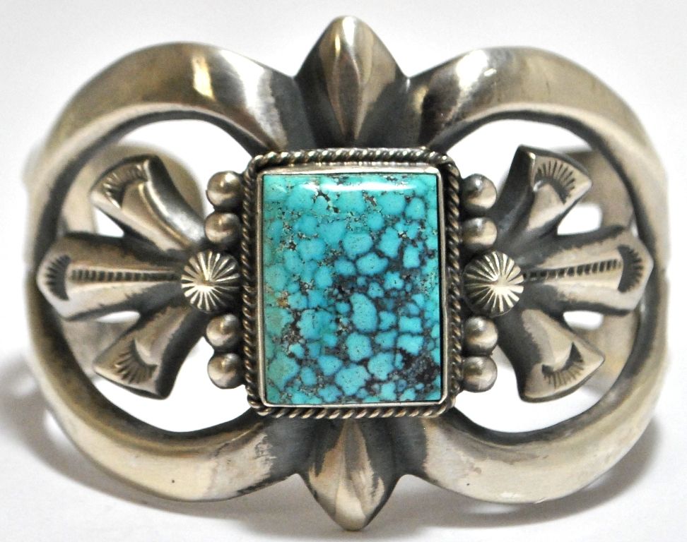 Old Pawn Navajo Spider Web #8 Turquoise Sterling Silver Cuff Bracelet - Harrison Bitsue