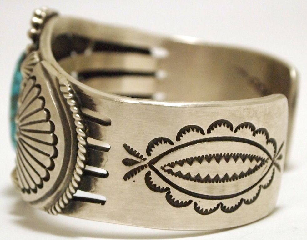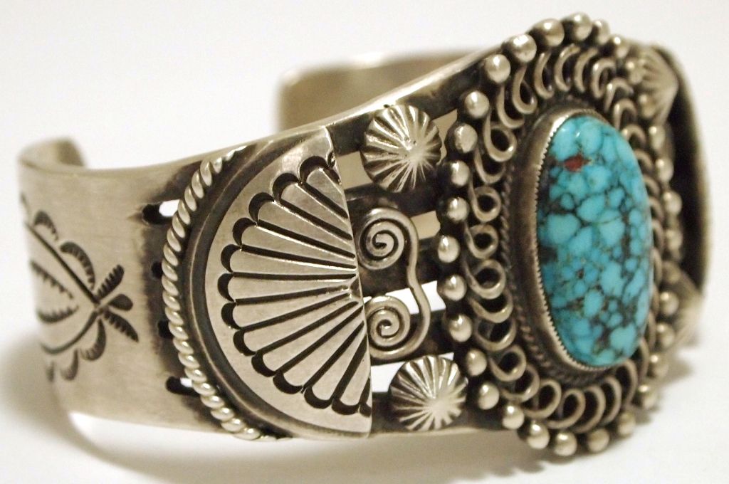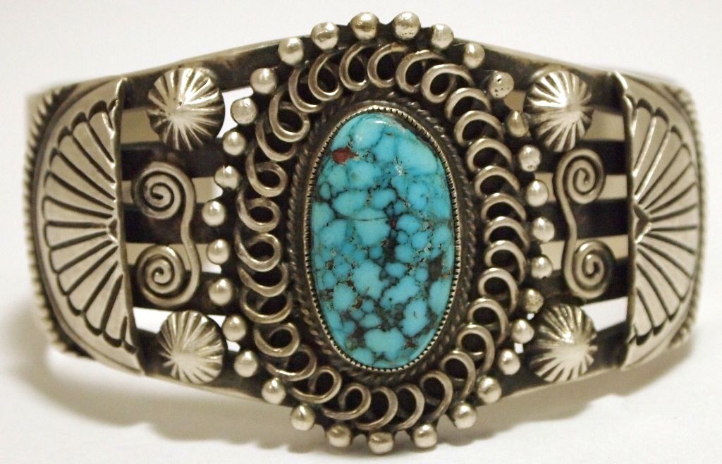 Old Pawn Navajo Spider Web Kingman Turquoise Sterling Silver Cuff Bracelet - Calvin Martinez