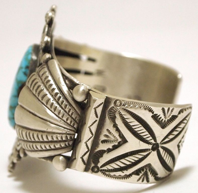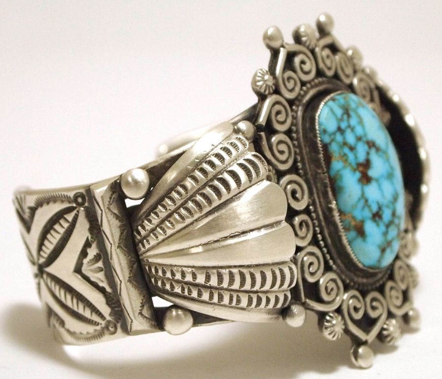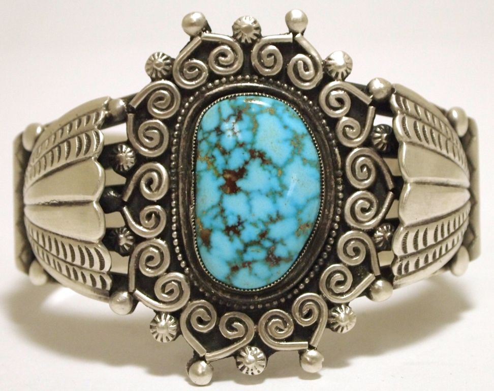 Old Pawn Navajo Spider Web Kingman Turquoise Sterling Silver Cuff Bracelet - DM