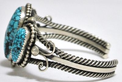Old Pawn Navajo Spider Web Kingman Turquoise Sterling Silver Cuff Bracelet - Nelvin Burbank